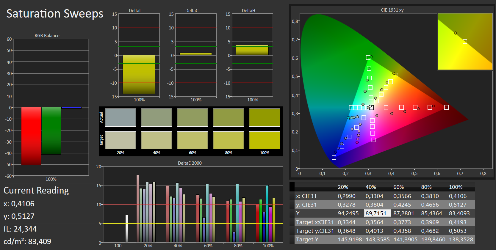 | Delta E Graustufen * | 13.34 | 13.46 -1% | 5.38 60% | 5.03 62% | 2.88 78% |