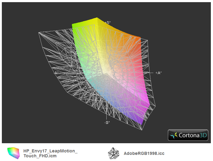 Der Farbraum könnte eine Rolle spielen, wenn das Envy mit Profi-Tools wie Adobe Lightroom, Quark XPress oder InDesign verwendet wird. Hierfür sollte ein TFT in besten Fall AdobeRGB oder wenigstens sRGB abdecken. Bis auf wenige HighEnd-Workstations haben Laptops diese Ziele allerdings fast nie erreicht. Auch beim Envy 17 und seinen Konkurrenten ist das der Fall.