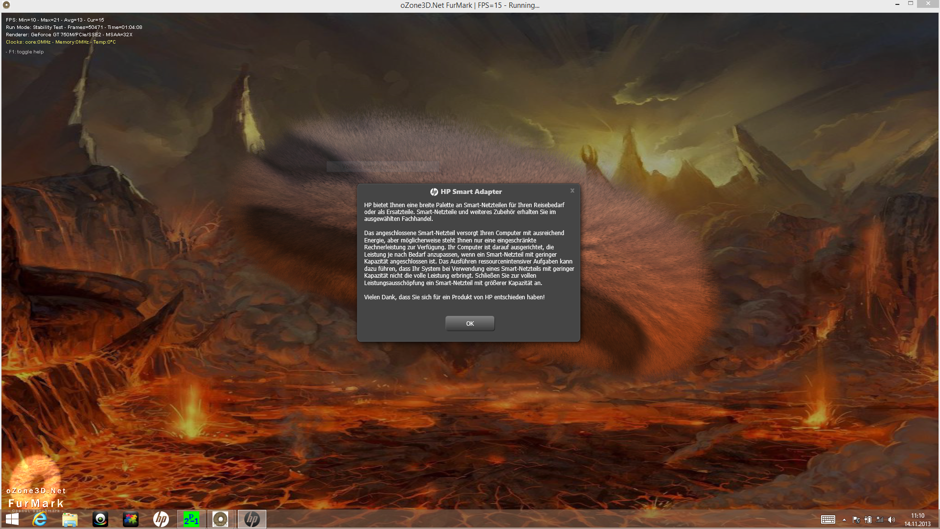 Bei konstanter Höchstlast, die wir in unserem Stresstest (Prime95 + Furmark) testweise anlegen, kommt das 120-Watt-Netzteil des HP scheinbar in Bedrängnis. Zumindest geht eine Meldung auf, die den Erwerb eines stärkeren Adapters nahelegt (Smart Netzteil mit größerer Kapazität). Nur hat HP gar keinen solchen im Zubehör-Programm.