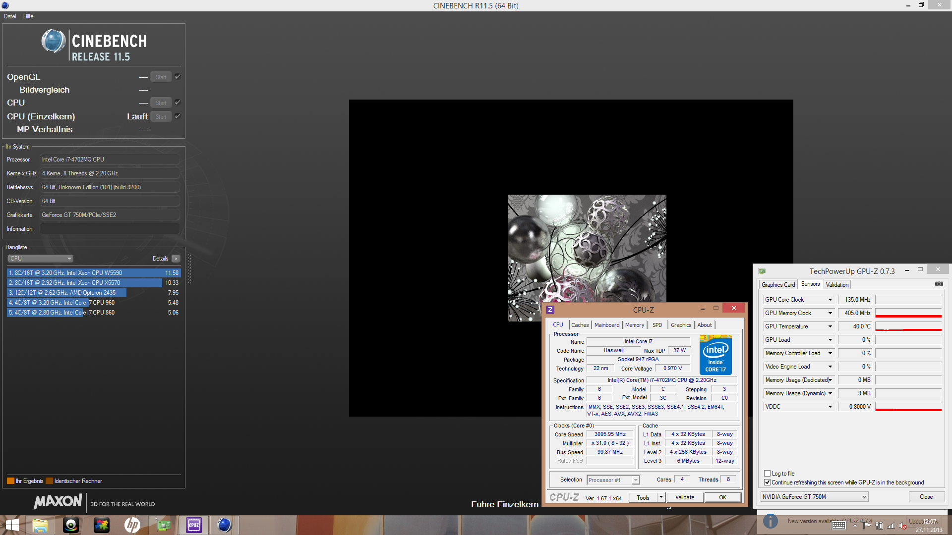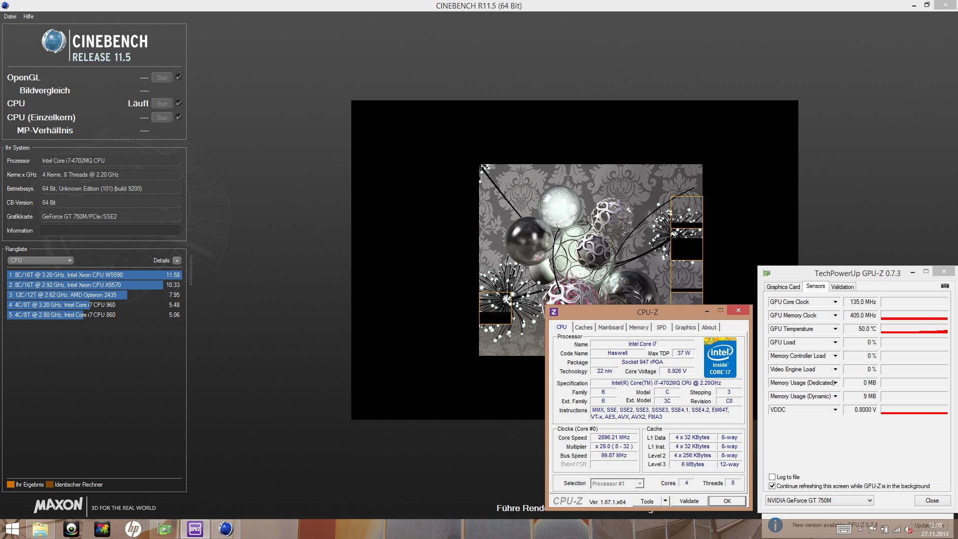 Die hohe Leistung sehen wir beim Turbo-Takt bestätigt, bis 3,1 GHz schnell agiert der 4702MQ im Single-Thread. Mehrkern-Belastung liegt bei 2,9 GHz. Im Akkubetrieb liegen dieselben, hohen Frequenzen an (alle R11.5-Ergebnisse inklusive OpenGL ident).