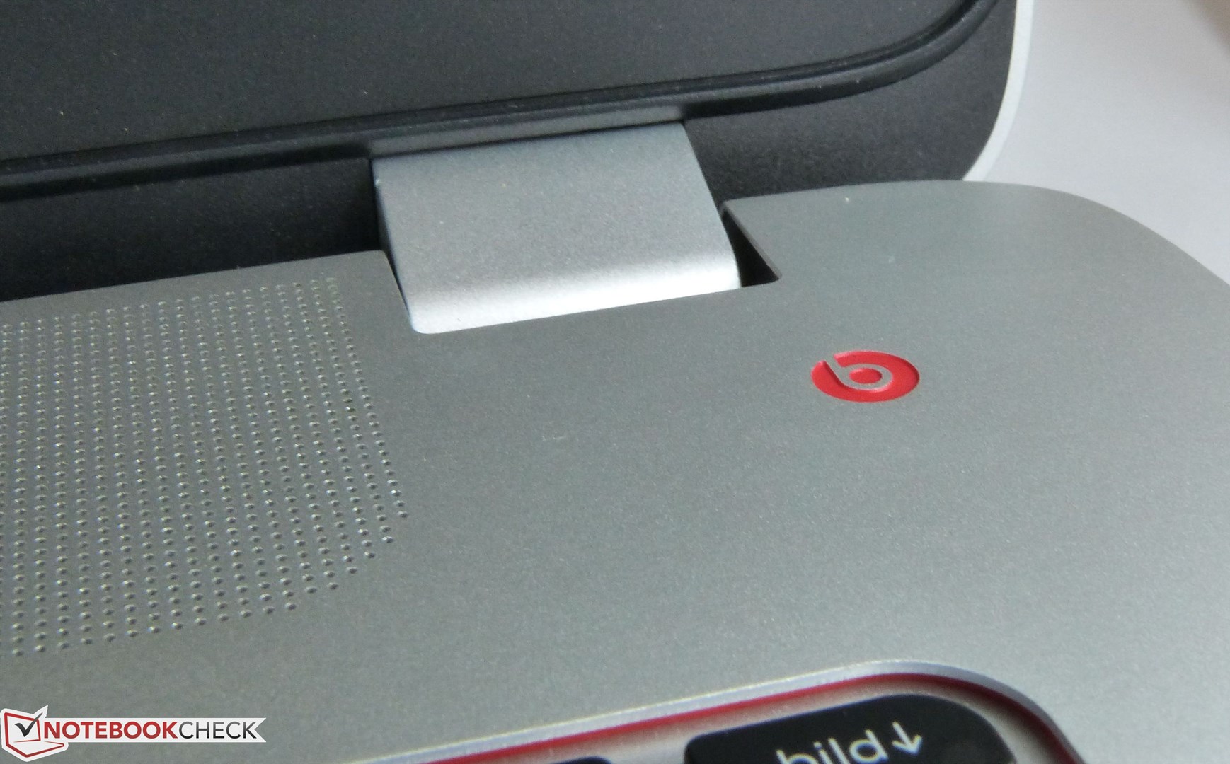 Steht das Notebook auf dem Tisch, zeigt es den Nutzer einen HP Schriftzug sowie gleich zwei Beats-Audio-Logos. Auf der Rückseite platziert der Hersteller ausschließlich Eigenwerbung: Ein großes HP Logo auf der Display-Rückseite sowie einen Hewlett-Packard-Schriftzug zwischen den Display-Scharnieren.