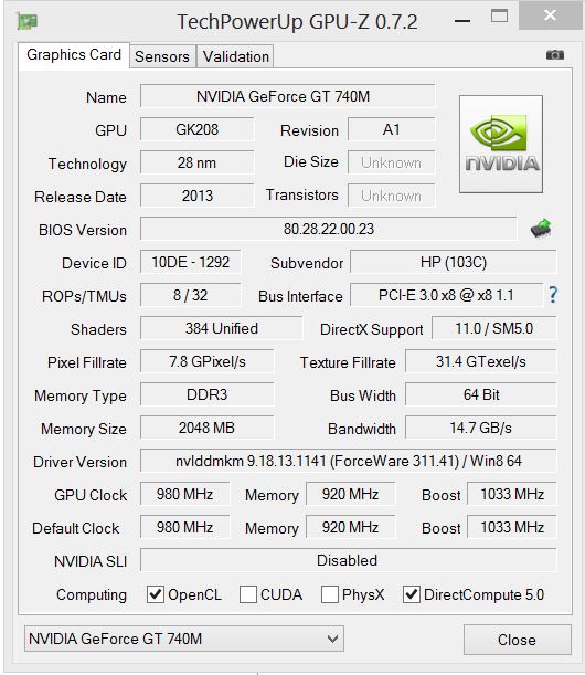 Neben der von Intel in den Prozessor integrierten HD-4600-GPU verfügt das HP Envy 17 auch über einen dedizierten Grafikchip aus dem Hause Nvidia. Die GT 740M kann auf 2 Gigabyte DDR3-RAM zurückgreifen und bietet eine deutlich höhere Leistung als die Intel GPU.