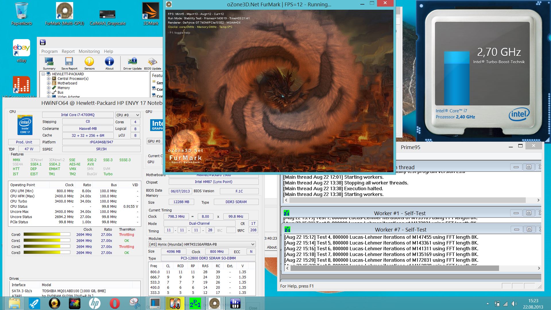 An Prozessor-Power mangelt es dem HP Envy 17 definitiv nicht. Zum Einsatz kommt Intels aktueller Haswell Bolide Core i7-4700MQ, ein Quadcore-Prozessor mit Support für Hyperthreading. Aus diesem Grunde werden dem Betriebssystem nicht nur vier, sondern acht Rechenkerne angezeigt; einige Programme profitieren sichtbar von der durch HT möglichen besseren Auslastung der Prozessorkerne.