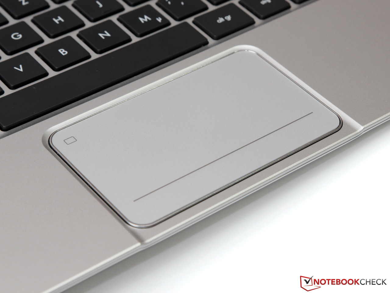 Das mit einer schicken Chrom-Umrandung eingefasste Touchpad stammt von Synaptics und misst rund 9 x 5,5 Zentimeter. Die fein strukturierte, metallisch wirkende Oberfläche bietet hervorragende Gleiteigenschaften und unterstützt alle gängigen Multitouch-Gesten mit bis zu 4 Fingern. Per Druck auf die linke oder rechte untere Ecke des Pads kann ein Mausklick ausgelöst werden, was auch als Clickpad-Bauweise bezeichnet wird. Dank des knackigen Anschlags und der überzeugenden Material- und Verarbeitungsqualität haben wir dedizierte Tasten zu keiner Zeit vermisst.