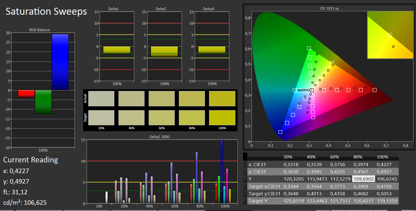 Die Farbdarstellung des verbauten Panels weiß schon im Auslieferungszustand zu gefallen. Mit einer DeltaE-2000-Abweichung von 4,35 scheitert der Bildschirm nur knapp am Zielbereich (DeltaE kleiner 3). Einen Blaustich zeigt der Bildschirm nicht.