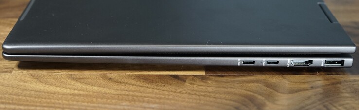 Die Ausstattung bleibt ebenfalls gleich, sodass das HP Envy x360 15 mit einer vergleichsweise soliden Anschlussvielfalt aufwartet. Da es sich um den gleichen Prozessor wie im Vorgängermodell handelt, wenn auch mit geändertem Namen, bleibt USB-4 leider fern. Ein proprietärer AC-Adapter ist nicht verfügbar, sodass einer der beiden USB-C-Ports beim Ladevorgang immer belegt ist. Auch die Positionierung der Anschlussstellen ist nicht ideal, da beide USB-C-Anschlüsse auf der rechten Seite zu finden sind. Eine Lademöglichkeit auf beiden Seiten wäre vorteilhafter gewesen.