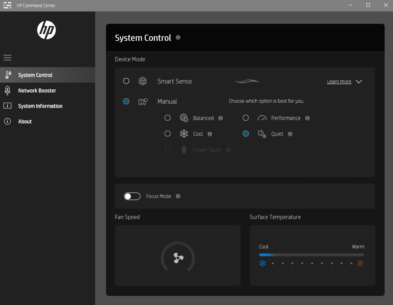 Über das HP Command Center lassen sich zusätzlich zu den Windows-eigenen Leistungsmodi weitere Einstellungen für die TDP des Convertibles vornehmen. Für unseren Test wurden das HP Command Center und die Windows-Leistungseinstellungen als Leistungsmodus gewählt. Ohne das HP Command Center kann die maximale Leistung des Gerätes nicht ausgeschöpft werden.