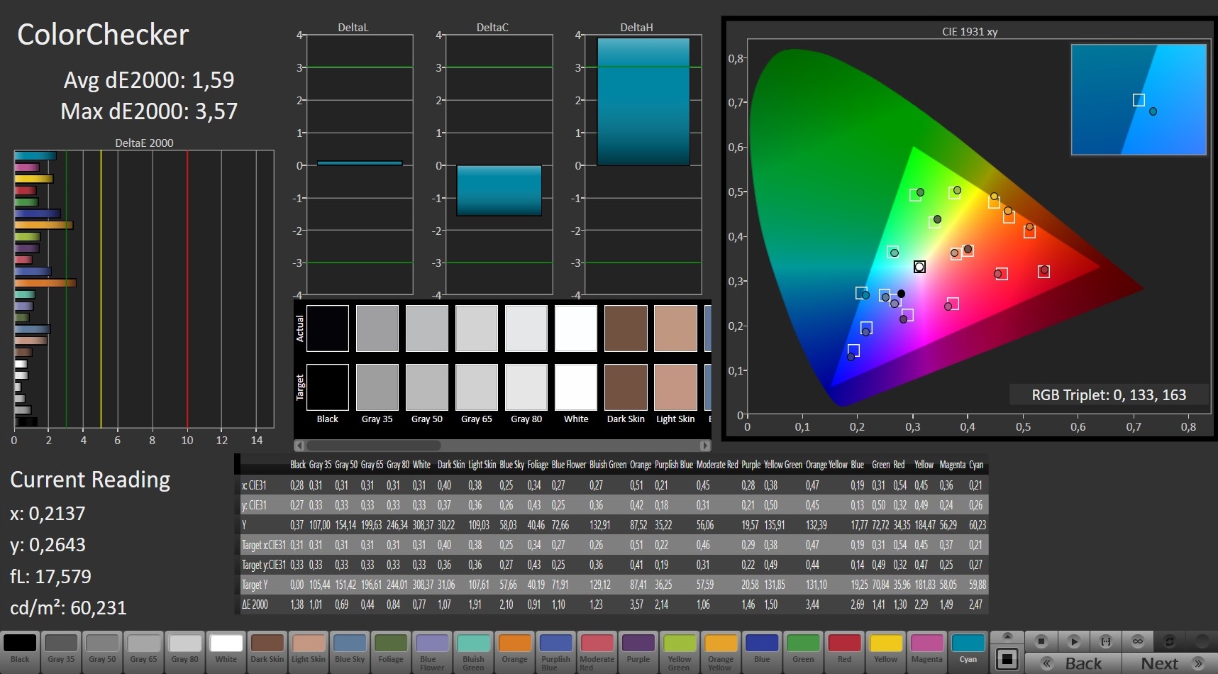 | Delta E Colorchecker * | 3.19 | 4.5 -41% | 4.13 -29% | 9.65 -203% | 5.1 -60% | 5.53 -73% |