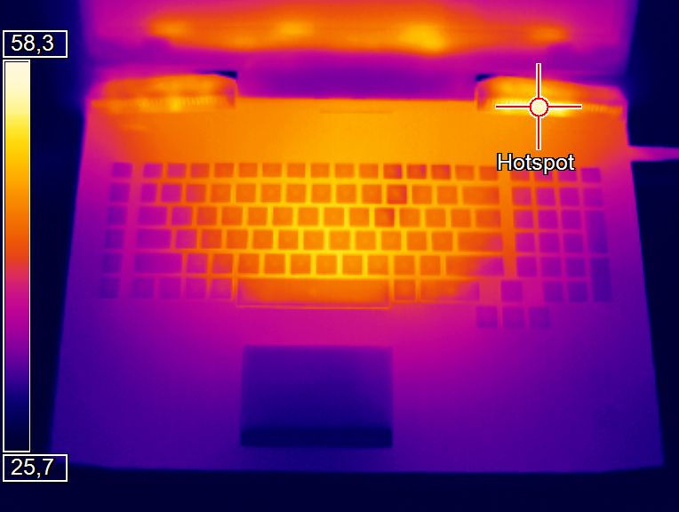 Zonentechnisch bleibt zumindest die Handballenauflage halbwegs kühl. Die Hitzezonen fallen in den mittleren und hinteren Bereich, wo auch die Luftschächte sitzen. Leider ist die Tastatur ebenfalls recht großflächig davon betroffen. Auf den Oberschenkeln empfiehlt sich ein Spielen also eher nicht, wobei bereits das Gewicht ein solches Vorhaben unbequem erscheinen lassen.