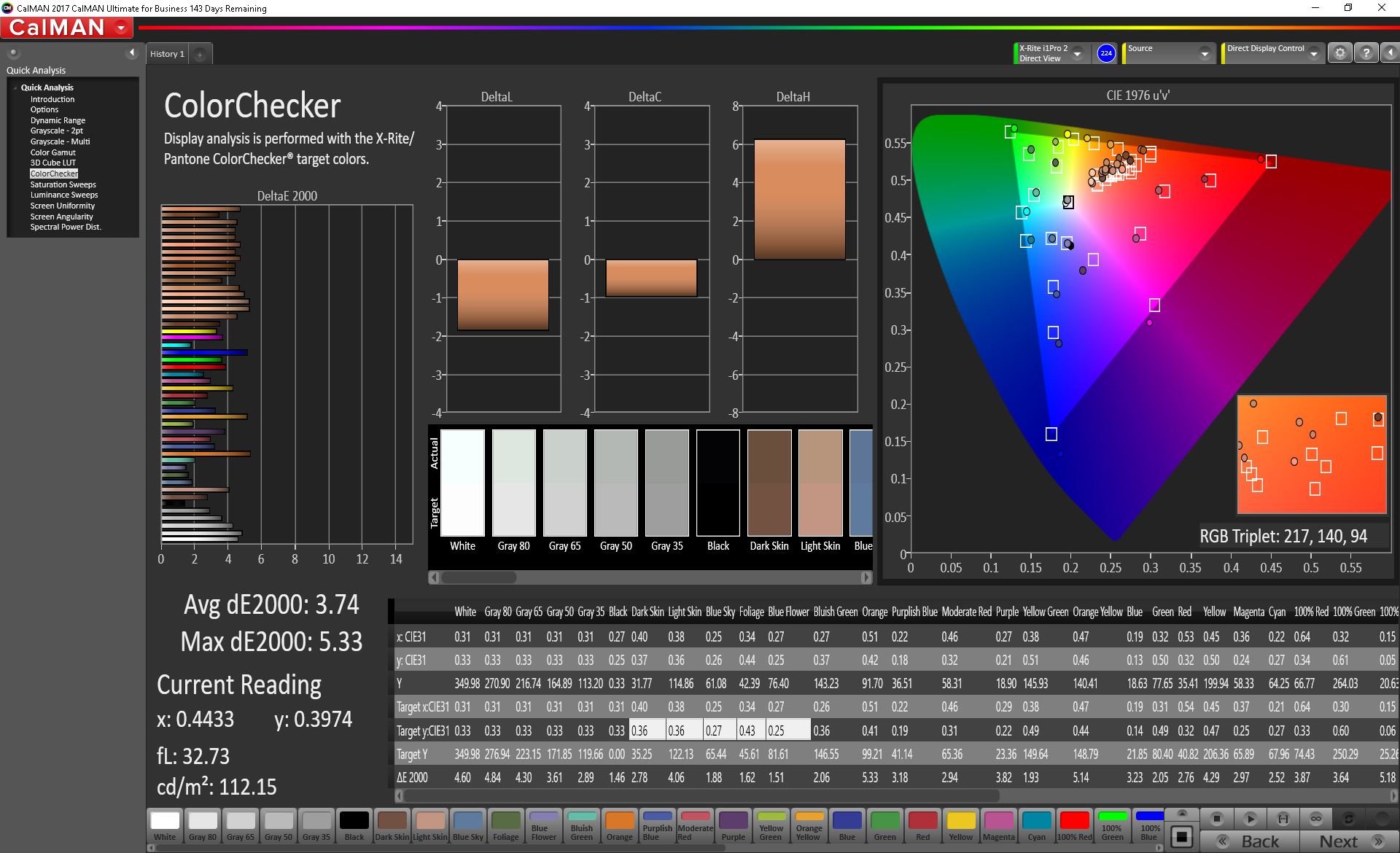Wie bereits erwähnt war die Farbgenauigkeit des Panels hervorragend. Ab Werk liegt der DeltaE-Wert für Farben bei 3,74 und ist damit für ein Gaming-Notebook sehr gut. Damit ist das Display sogar beinahe für professionelle Bildbearbeitung mit Ansprüchen an Farbechtheit geeignet, schließlich liegt es nur ganz knapp über dem Schwellwert von 3. Durch Kalibrierung konnten wir diesen Wert nur minimal erhöhen. Dies deutet darauf hin, dass das Display vor dem Versand an uns bereits vorkalibriert wurde. Das Aorus X9 DT, welches mit exakt demselben AU-Optronics-Panel ausgestattet ist, war sogar noch eine Ecke akkurater. Es gibt also durchaus noch Spielraum nach oben.