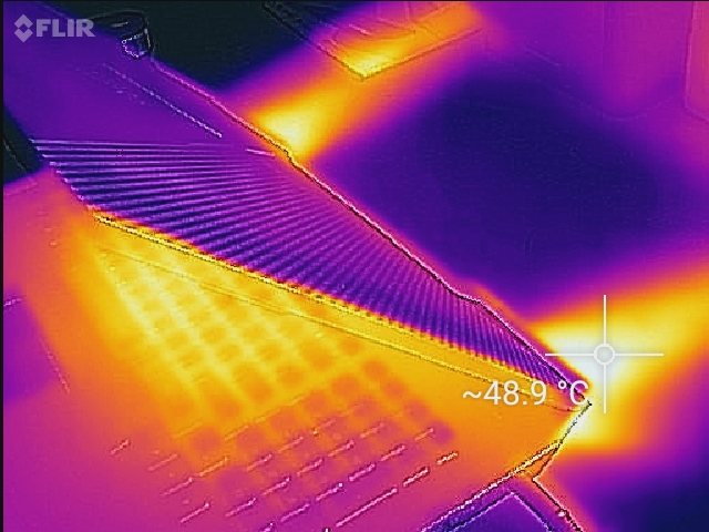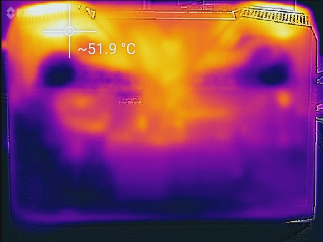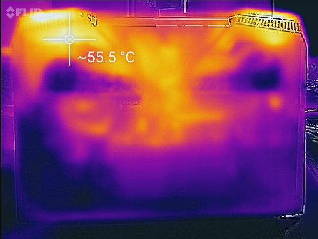 (-) Auf der Unterseite messen wir eine maximalen Wert von 55.8 °C (im Vergleich zum Durchschnitt von 43.3 °C).