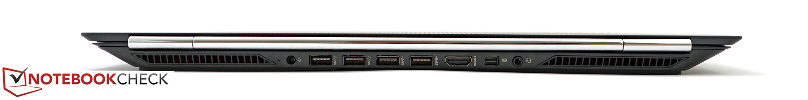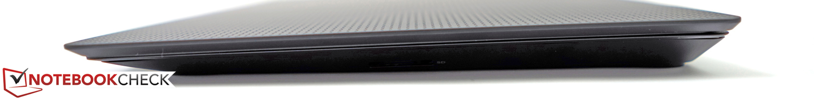 Obwohl wir im Businessbereich ja immer wieder fordern einen Teil der Anschlüsse an die Rückseite zu positionieren, sind wir auch mit der "Alles-oder-nichts"-Lösung des HP Omen Pro am Heck nicht zufrieden. Zumindest einen USB-Port und den Audio-Port hätten wir uns im vorderen Bereich gewünscht, um mal schnell und unkompliziert einen Stick, eine Festplatte oder ein Headset anschließen zu können. Schade. Lediglich der Cardreader hat es an die Seite geschafft, überzeugt aber auch hier wegen der schrägen Seitenteile nicht unbedingt mit vorbildlicher Benutzerfreundlichkeit. Der Schlitz lässt sich schlecht ertasten und das Einsetzen und Herausnehmen von Speicherkarten ist insgesamt recht fummelig. Ein Dockingport, um beispielsweise das Dockingstation-Programm der ZBook-Serie nutzen zu können, ist nicht vorhanden. Auch auf ein optisches Laufwerk, einen Modulschacht oder einen wechselbaren Akku muss man verzichten. Auf der Habenseite findet man natürlich das ans Heck verlagerte Kabelaufkommen, das beim Arbeiten nicht stört. Auch die Anschlussausstattung inklusive 4 x USB 3.0 und DisplayPort 1.2 kann sich insgesamt sehen lassen. Der eigentlich fehlende Ethernet-Port wird durch einen beiliegenden USB-Adapter aufgefangen. Der HDMI-Anschluss arbeitet noch nicht nach dem Standard 2.0. Daher ist die Ausgabe der 4k-Auflösung nur per DisplayPort mit 60 Hz möglich. USB 3.0 und Kartenleser arbeiten mit gemessenen Übertragungsarten von 427 MB/s und 87 MB/s recht schnell und stellen keinen Flaschenhals dar. Lediglich schnelle UHS-II Speicherkarten, die über 100 MB/s erreichen können, werden durch den UHS-I Kartenleser bei etwa 90 MB/s ausgebremst. Getestet haben wir mit Samsungs T1 SSD (256 GB), Toshiba Exceria Pro UHS-II (16 GB) und Sandisks Extreme Pro UHS-II (16 GB).