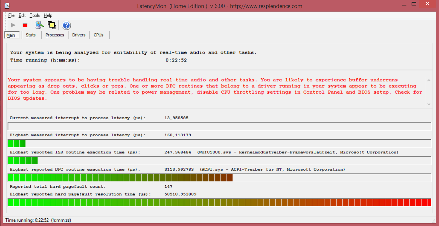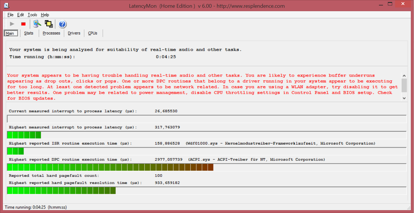 Beim Überprüfen der möglicherweise auftretenden Latenzen, etwa beim Nutzen externer Audio-Hardware, zeigt uns das Tool LatencyMon einen ACPI-Treiber an, der für auftretende Dropouts verantwortlich sein könnte. Auch ein Kernelmodus-Treiber sorgt immer wieder für Verzögerungen von über 3.000 µs. Hier ist man wohl auf entsprechende Updates angewiesen, die bis zum Redaktionsschluss aber noch nicht verfügbar waren.