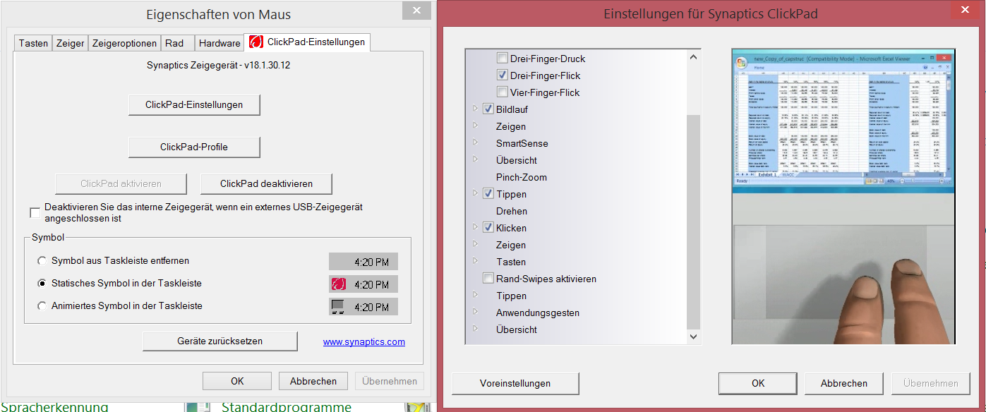 Ein eher selten zu sehendes Ausstattungsdetail stellt der Touchscreen bei einer mobilen Workstation dar. Dabei kann man sich vor allem unter Windows 8.1 schnell an dieses komfortable Feature gewöhnen. Einmal eine Zeit lang genutzt, vermisst man schnell die Möglichkeit, Eingaben über den Bildschirm vorzunehmen, wenn mal ein anderes Gerät ohne Touchpanel verwendet wird. Leider unterstützt der Bildschirm keine Digitizer-Funktion, womit man eine aktive Stiftunterstützung erhalten würde. So muss man also entweder mit dem Finger oder den üblichen Gummi-Knubbel-Stiften (kapazitiv) zurechtkommen. Zusammen mit der FullHD-Auflösung stellen wir bei dieser Eingabemethode eine sehr gute Genauigkeit fest, die auch im Desktop-Modus nach etwas Eingewöhnung keine Fehleingaben mehr hervorruft. Leider spiegelt die glatte Displayoberfläche stark und ist sehr anfällig für Fingerabdrücke. Das liegt zum großen Teil natürlich in der Natur der Sache, dass es dennoch nicht ganz so extrem ausfallen müsste, zeigt zum Beispiel Apples iPad Air 2.