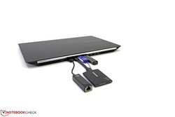 Da HP beim Omen keinen proprietären Dockingport verbaut, muss man bei Bedarf auf Universallösungen mit USB-Anschluss zurückgreifen. Auch sonst sehen die Erweiterungsmöglichkeiten mau aus. Kein Wechselschacht, keine Alternativ-Akkus, kein optisches Laufwerk und keine Massenspeicheroptionen. Hier bleibt dem Anwender auch wieder nur der Griff zu externen Universallösungen, die man dann immerhin geräteunabhängig verwenden kann. So zum Beispiel HPs externer DVD-Brenner (F2B56AA, 55 Euro), der auch optisch zum Omen Pro passt. Etwas irreführend ist das auf der Hompage als Zubehör gelistete Kabelschloss, wofür es am HP Omen Pro aber gar keine Vorrichtung gibt.