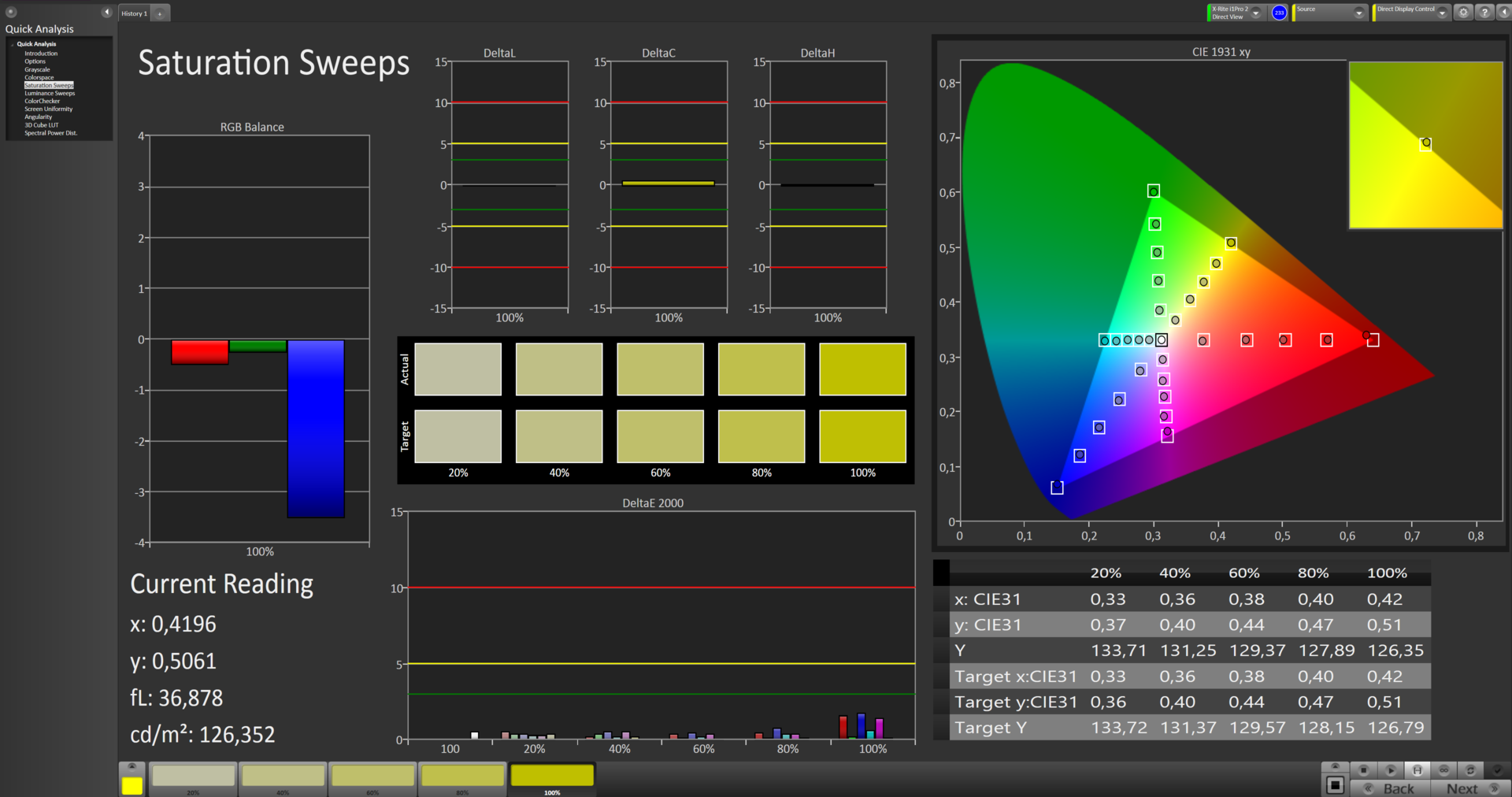 Zum guten Bildeindruck trägt auch die Farbraumabdeckung ihren Teil bei. Mit einer Wiedergabe von 96 % des sRGB-Farbraums bewegt sich der Bildschirm auf einem guten Niveau, was vielen professionellen Anwendern ausreichen dürfte. Farben werden vergleichsweise differenziert dargestellt und sorgen so für Farbnuancen, die bei billigen Einsteigerpanels gänzlich verborgen bleiben. Auch die Farbgenauigkeit ist nach der obligatorischen Kalibrierung und Profilierung durch ein Colorimeter für professionelle Bereiche sehr gut geeignet. Mit einem maximalen DeltaE 2000 von 1,61 bei Schwarz, einer ausgeglichenen Graubalance und genauen Gammawerten zeigt sich der Bildschirm nahezu perfekt. Ohne eine Profilierung eignet sich das Display wie so oft allerdings kaum für den anspruchsvollen Anwender. Die Graubalance driftet auseinander, die Gammawerte weichen stark von der Ideallinie ab und DeltaE 2000-Einzelwerte von über 5 sind keine Seltenheit.
