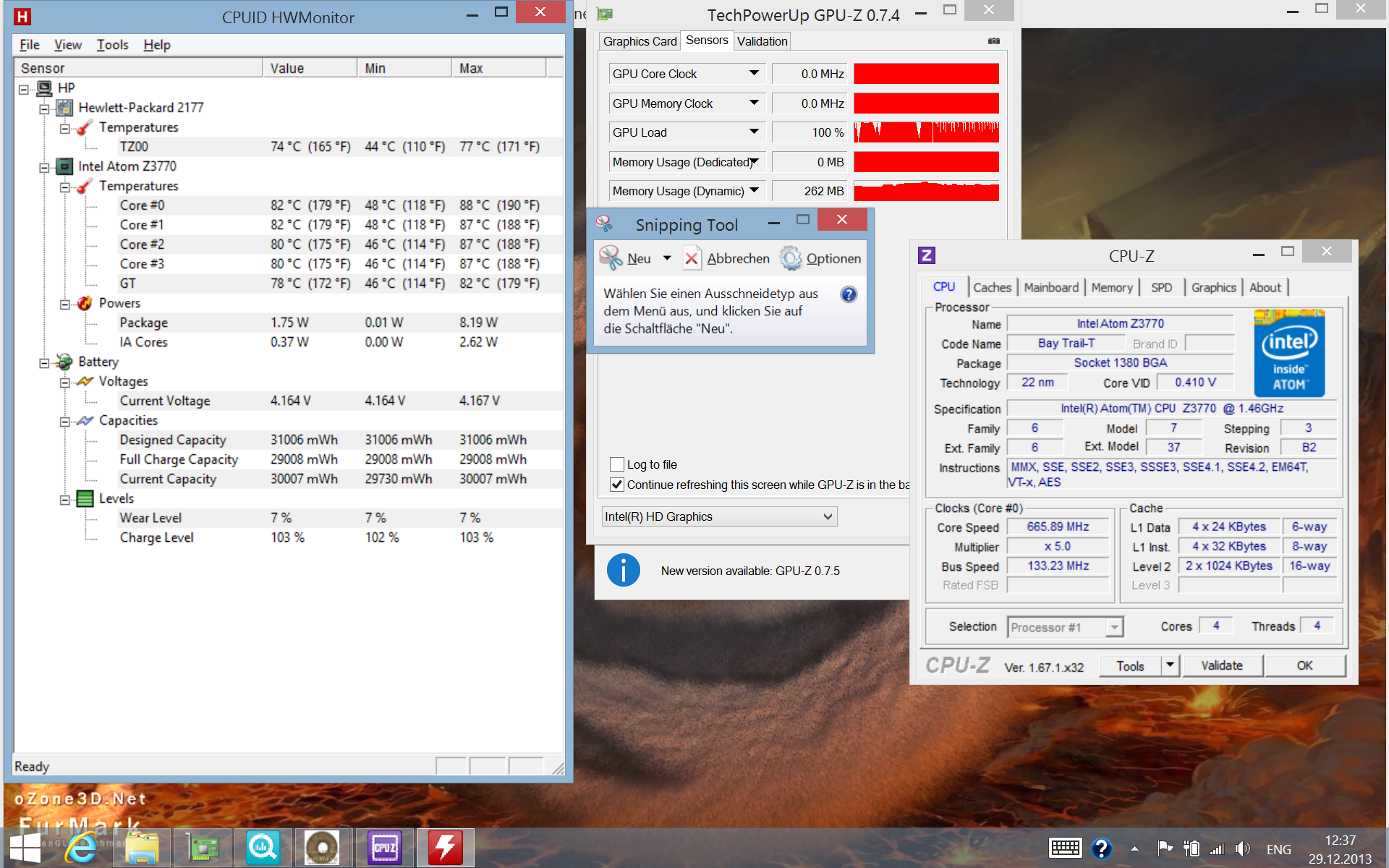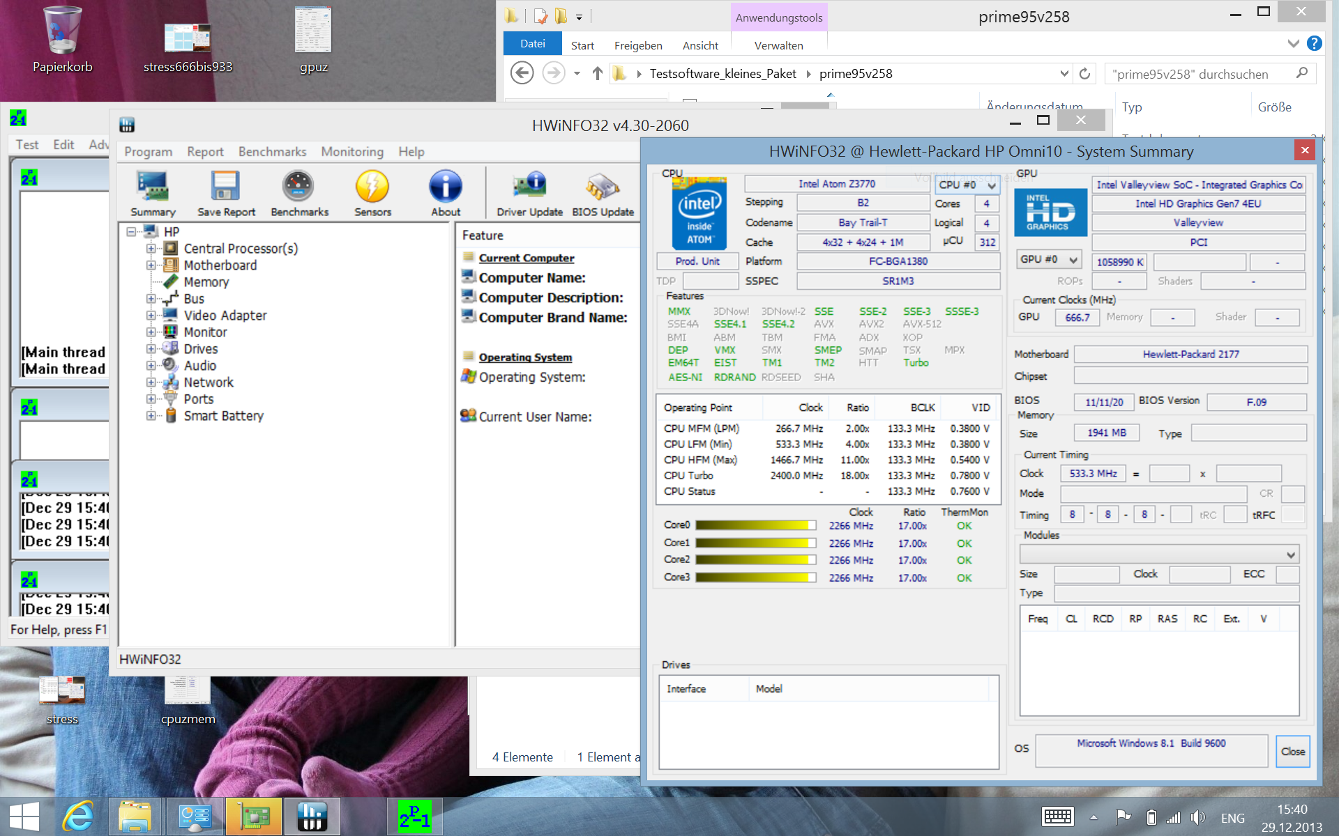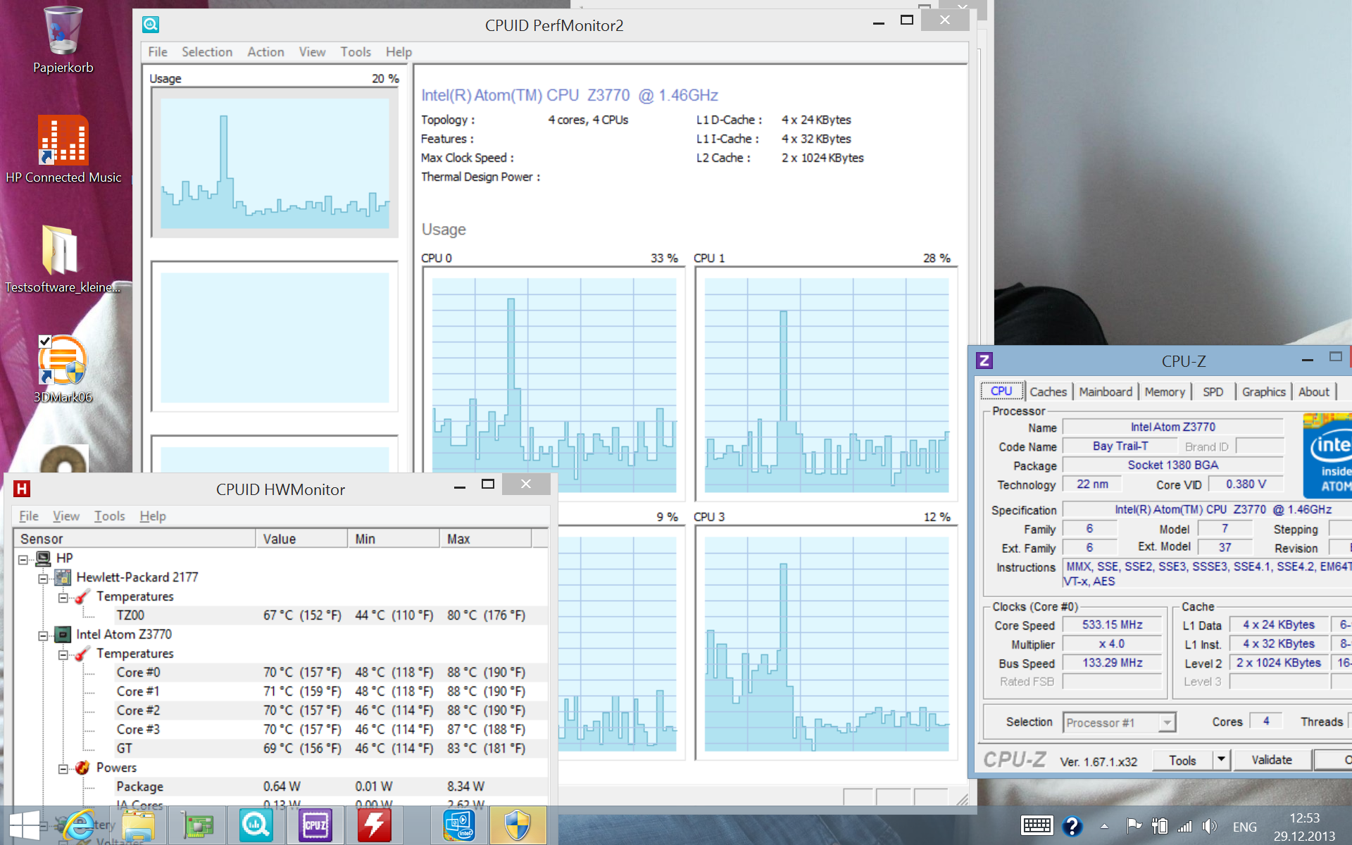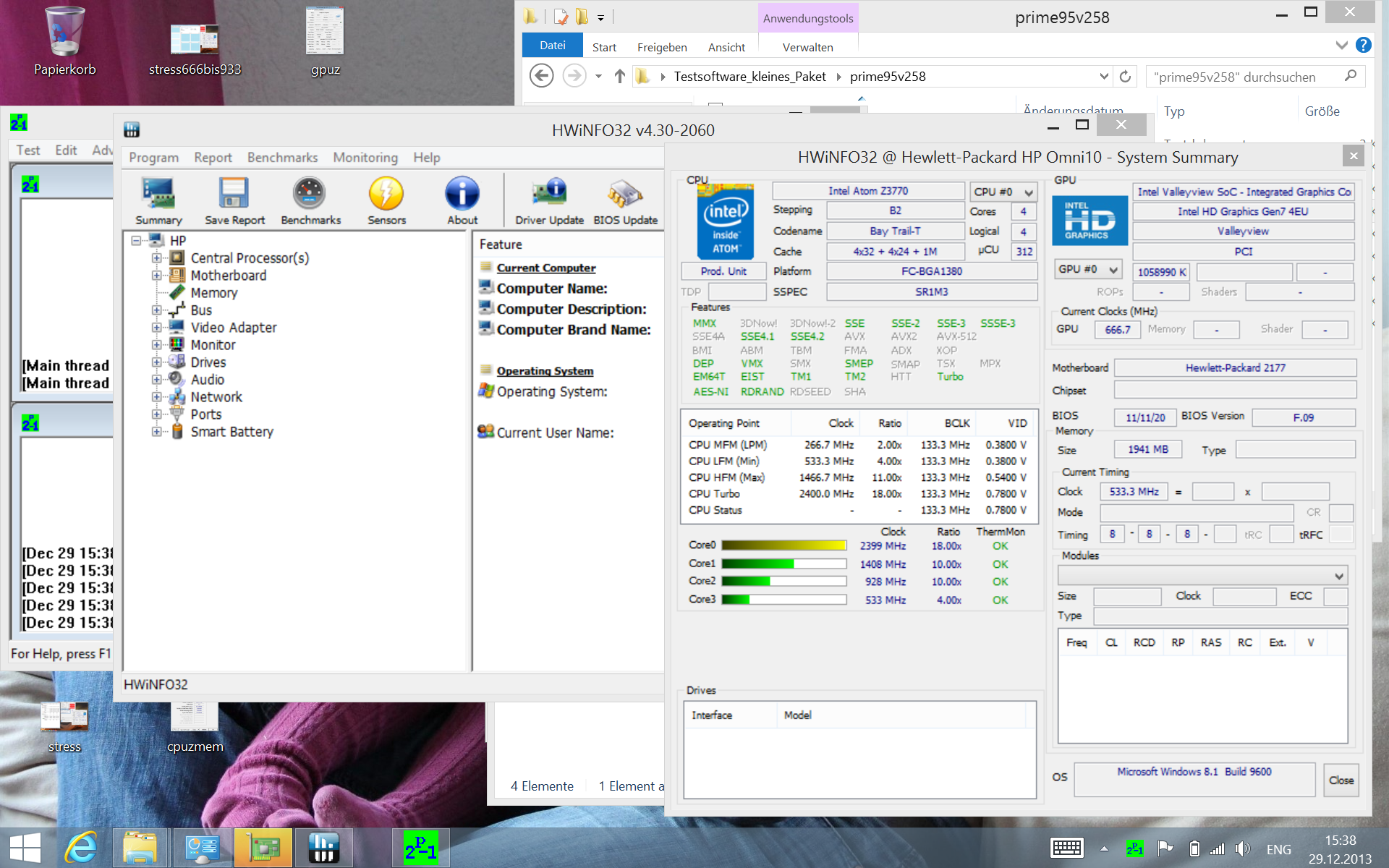 Das hat mit Bay Trail ein Ende. Wir haben Prime95 Multi laufen lassen und konnten zeitgleich ein H264-Video abspielen und im Browser surfen. Das war mit Clovertrail so nicht möglich. Siehe dazu unser obiges Video unter Eingabegeräte, im zweiten Teil läuft Prime95 im Hintergrund.