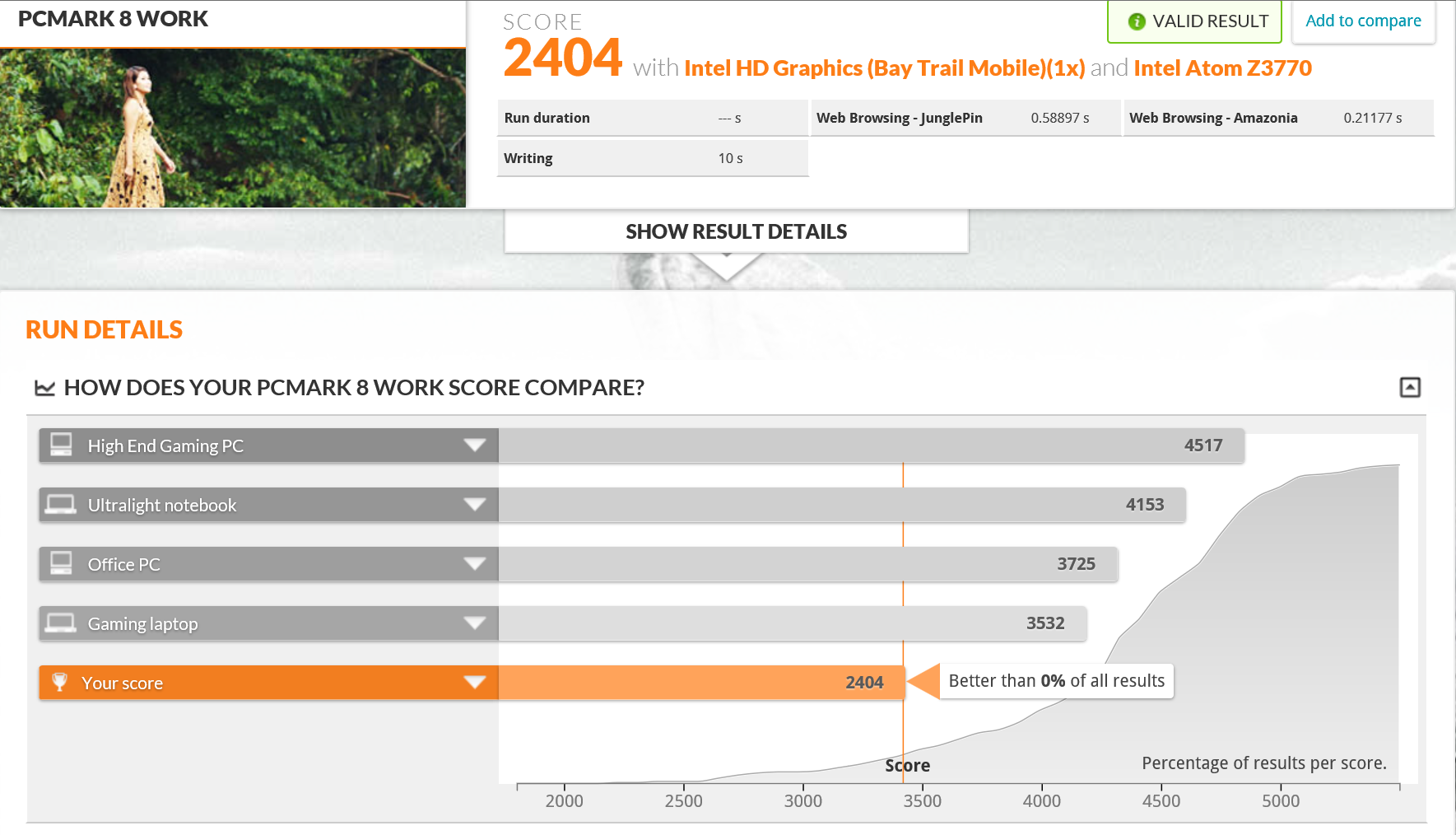 Die Z3000 Serie von Intel wird in sparsamer 22-nm-Lithographie gefertigt, so wie auch die Haswell Chips aus den Subnotebooks und Notebooks. Intel gibt einen TDP von <4 Watt an, die Scenario Design Power liegt bei lediglich zwei Watt. Wie die Haswell Prozessoren besitzt der Bay-Trail-Atom eine Turbo Range, im Falle des Z3770 von 1.460 bis 2.400 MHz (Z3740: 1.330–1.860 MHz). Cinebench R10 als auch Geekbench zeigen ein Leistungsplus von durchschnittlich 17 % zum Z3740 Schwestermodell (drei Vergleichsgeräte). Der alte Z2760 ist mit -55 % im Rückstand, das AMD Gegenstück A4-1200 mit -58 %.