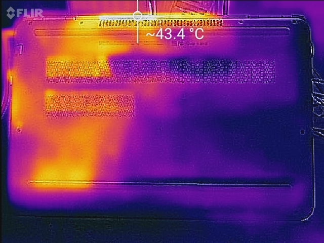 Bei wenig Last wärmt sich das Gehäuse nicht besonders stark auf, doch es gibt einen spürbaren Unterschied zwischen der linken und rechten Handballenauflage. Bei mehr Belastung wird die rechte Seite mit 38 °C beinahe unkomfortabel warm – hier liegt der Unterschied zwischen der rechten und linken Seite bei annähernd 20 °C. Die maximale Gehäusetemperatur liegt bei moderaten 42 °C hinten rechts. Das Quad-Core-Modell hat sich ganz ähnlich verhalten, während die Dual-Core-Version und auch das größere 17-Zoll-Modell deutlich kühler blieben. Zum Vergleich: Die Handballenauflage des Dell XPS 15 erreicht maximal 32 °C und es gibt auch nur einen kleinen Unterschied zwischen den beiden Seiten – auch wenn der Hotspot mit 50 °C sogar etwas wärmer ausfällt.
