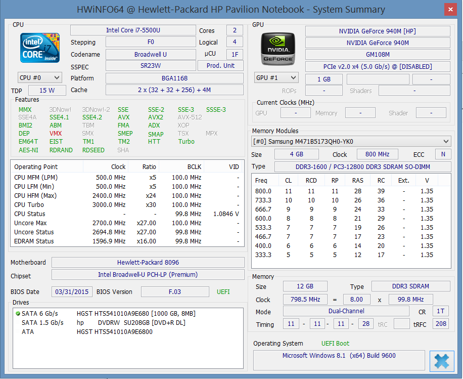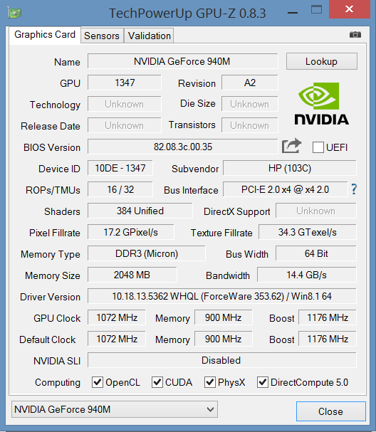 Mit dem GeForce 940M Grafikkern ist eine Mittelklasse-GPU in das Pavilion eingezogen. Zusammen mit der ebenfalls vorhandenen HD Graphics 5500 GPU bildet er eine Umschaltgrafiklösung (Optimus). Der Kern von Nvidia hat seinen Auftritt bei leistungsfordernden Anwendungen wie Computerspielen. Intels GPU ist für den Alltags- und Akkubetrieb zuständig. Die Umschaltung zwischen den Kernen erfolgt automatisch; der Nutzer muss sich um nichts kümmern.