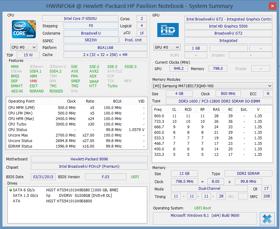 HP hat das Pavilion mit dem Intel Core i7-5500U Zweikernprozessor (Broadwell) ausgestattet. Unter den sparsamen ULV-Prozessoren gehört er zu den stärksten Modellen, die Intel aktuell zu bieten hat. Er bietet mehr als genug Rechenleistung für den Alltagsbetrieb und sollte die meisten Nutzer zufriedenstellen. Die CPU arbeitet mit einer Basisgeschwindigkeit von 2,4 GHz. Mittels Turbo kann die Geschwindigkeit auf 2,9 GHz (zwei Kerne) bzw. 3 GHz (ein Kern) beschleunigt werden. Bei Multi-Thread-Anwendungen kann die CPU ihren Turbo nicht ganz ausfahren und arbeitet mit 2,7 bis 2,8 GHz. Single-Thread-Anwendungen werden mit 2,9 bis 3 GHz bearbeitet. Das Verhalten ist im Netz- und im Akkubetrieb identisch.