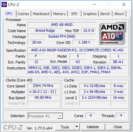 Angetrieben wird das Pavilion von einer AMD A10-9600P APU (Bristol Ridge). Bristol Ridge unterscheidet sich kaum von seinem Vorgänger (Carrizo). AMD hat hier primär Optimierungen durchgeführt. In der Folge kann die CPU ihren Turbo dauerhafter und stärker auszunutzen, wodurch die Leistung gegenüber Carrizo ansteigt. Mit einer TDP von 15 Watt bewegt sich die APU auf einer Höhe mit Intels ULV-Prozessoren. Der CPU-Teil der APU besteht aus einem Vierkernprozessor, der mit einer Basisgeschwindigkeit von 2,4 GHz arbeitet. Mittels Turbo ist eine Steigerung auf bis zu 3,3 GHz möglich. Die volle Turbogeschwindigkeit kommt so gut wie gar nicht zum Einsatz. In den von uns durchgeführten CPU-Tests arbeitet der Prozessor überwiegend mit 2,6 GHz. Selten wird ein Kern kurzzeitig auf 3,3 GHz beschleunigt.