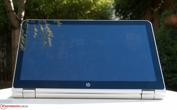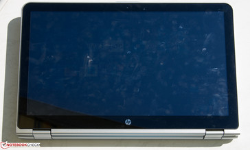 HP hat dem Pavilion ein IPS-Panel von Chi Mei spendiert. Dieses besitzt eine Auflösung von 1.920 x 1.080 Pixel und erreicht damit 141 ppi. Das spiegelnde Multitouch-Display hinterlässt einen guten Eindruck, ohne Makel ist es jedoch nicht. Die durchschnittliche maximale Helligkeit liegt bei mageren 209,8 cd/m². Für diese Preisklasse und den Einsatzzweck ist es schlicht zu dunkel. Sämtliche ausgewählten Konkurrenten stellen das Pavilion hier deutlich in den Schatten. Am hellsten strahlt hierbei das Lenovo Yoga 710-14ISK mit etwa 300 cd/m². Die anderen Werte hingegen können wieder mit der Konkurrenz mithalten und wissen zu überzeugen.