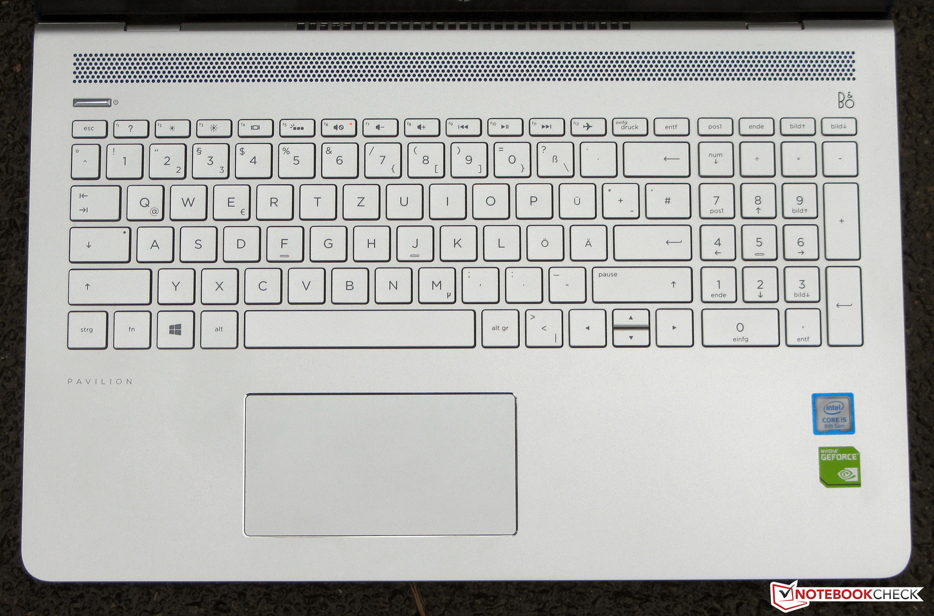 HP stattet das Notebook mit einer beleuchteten Chiclet-Tastatur aus. Die Beleuchtung wird mittels einer Funktionstaste gesteuert. Es gibt nur eine Helligkeitsstufe. Die glatten Tasten verfügen über einen kurzen Hub und einen klaren Druckpunkt. Während des Tippens gibt die Tastatur allenfalls minimal nach. Als störend hat sich das nicht erwiesen. Alles in allem liefert HP hier eine ordentliche Tastatur, die auch für regelmäßige Schreibarbeiten gemacht ist.