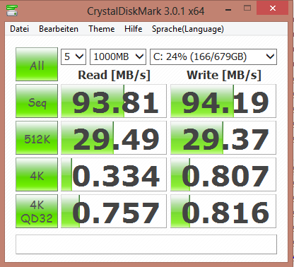 Hewlett Packard hat das Pavilion mit einer Festplatte aus der Travelstar 5K1000 Serie von HGST ausgestattet. Diese besitzt eine Kapazität von 750 GB und arbeitet mit 5.400 Umdrehungen pro Minute. CrystalDiskMark meldet eine Lesegeschwindigkeit von 93,81 MB/s. HD Tune liefert eine durchschnittliche Transferrate von 82,1 MB/s. Hervorzuheben ist noch die geringe Zugriffszeit von 16,5 ms. Insgesamt weiß die Festplatte zu gefallen. Sie bietet viel Speicherplatz und arbeitet nicht zu langsam. Die Platte würde auch manch teureren Notebooks gut stehen.