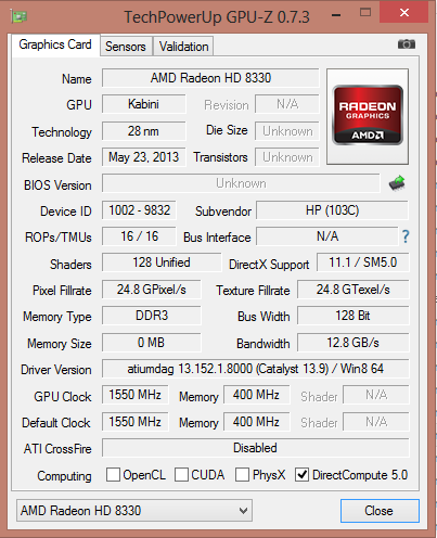 Der Grafikkern des Pavilion stammt ebenfalls von AMD und trägt die Bezeichnung Radeon HD 8330. Er unterstützt DirectX 11.1 und arbeitet mit einer Geschwindigkeit von 500 MHz. Einen Turbo gibt es nicht. In allen 3D Mark Benchmarks liefert das Pavilion bessere Ergebnisse als das Ativ Book (Pentium 2117U, HD Graphics (Ivy Bridge)), da die AMD GPU ihrem Intel Pendant überlegen ist. Der Intel GPU des Aspire (Core i3-4010U, HD Graphics 4400) ist wiederum der Radeon Kern unterlegen. Die Radeon GPU ist leistungsmäßig etwa auf dem Niveau von Intels HD Graphics 4000 Grafikchip einzuordnen.