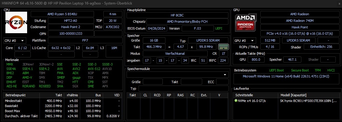 Das von uns getestete Pavilion 16-Modell hört auf die Bezeichnung ag0057ng und beherbergt neben dem genannten Ryzen 5 8540U auch 16 GB LPDDR5-6.400-RAM und eine 1 TB große NVMe-SSD. Der Bildschirm ist im 16:10-Format gehalten und löst mit 1.920 x 1.200 Pixeln auf. Als Betriebssystem installiert HP Windows 11 Home vor.