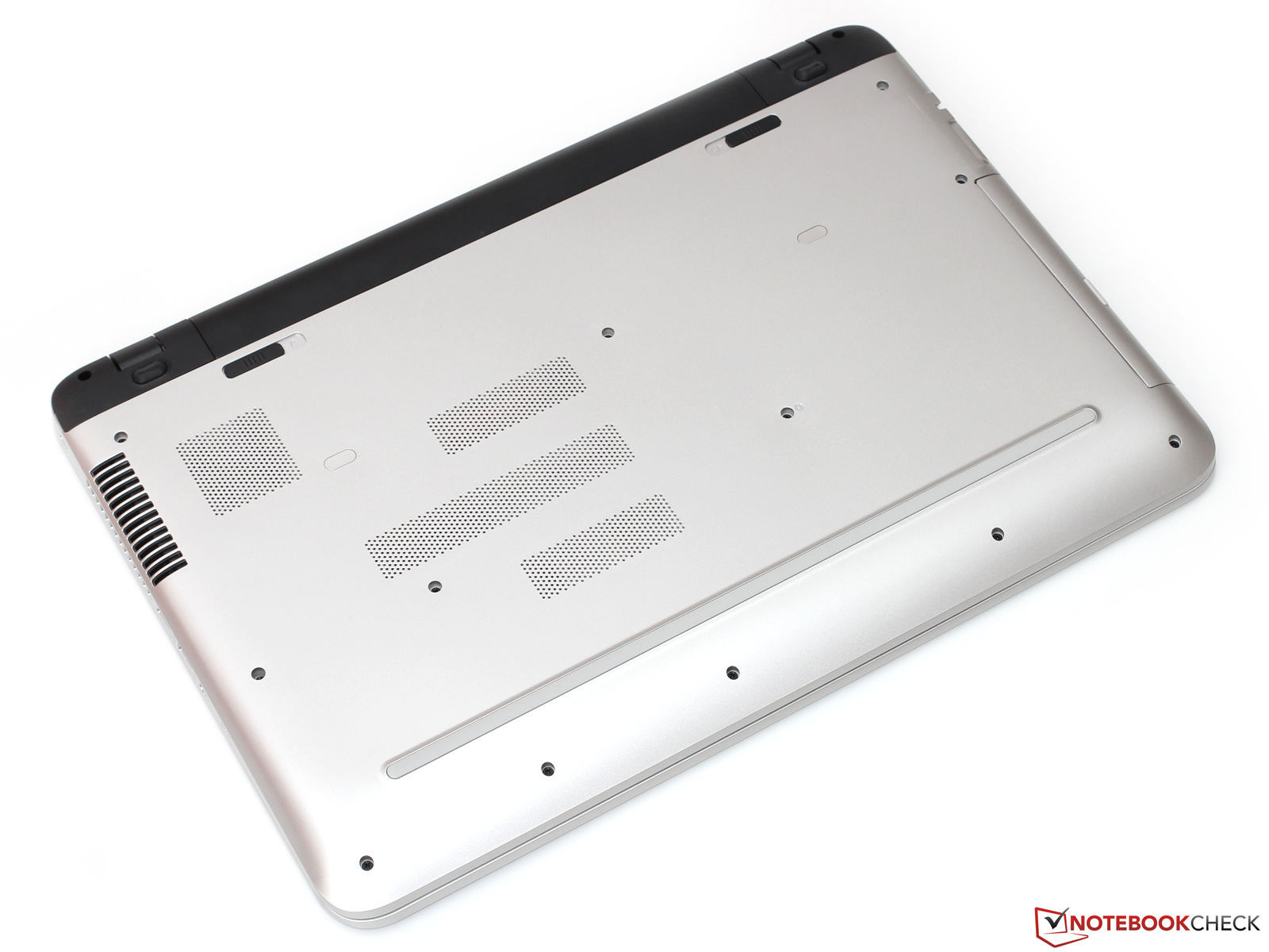 Mangels Wartungsklappe haben wir zum Öffnen des Gerätes unser Werkzeug bemüht und sämtliche sichtbaren Schrauben an der Unterseite entfernt. Leider ohne den gewünschten Erfolg – beide Teile der Basiseinheit bleiben weiterhin fest zusammen. Wie sich im Test des Pavilion 17-g013ng herausgestellt hat, müsste die Oberschale anschließend vorsichtig herausgehebelt werden, was wir bei unserem Leihgerät in diesem Fall nicht praktisch ausprobieren wollten. In jedem Fall hätte HP das Thema Wartung besser lösen können; für Laien ist selbst ein simpler Tausch von Festplatte oder Arbeitsspeicher nicht ohne Weiteres möglich.