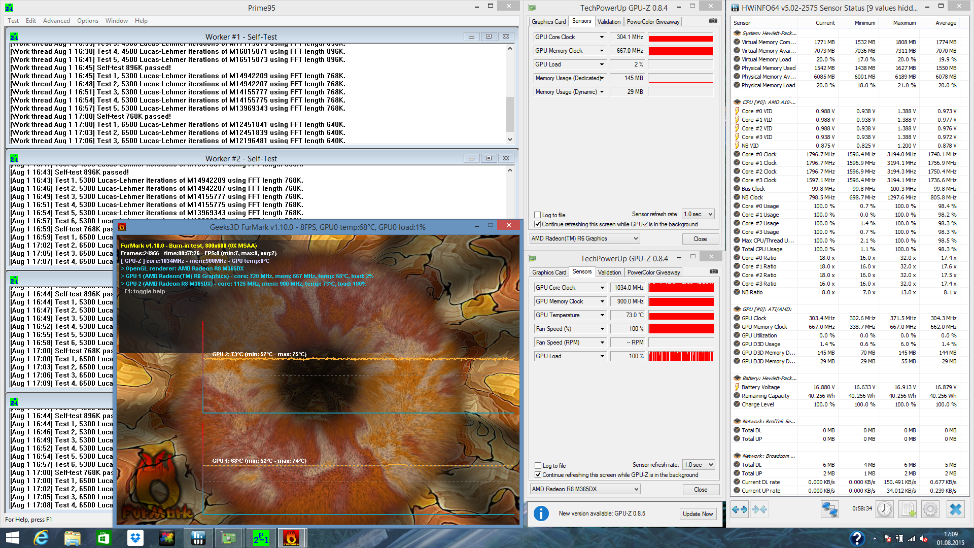 Nach einstündiger Belastung mit Prime95 und FurMark vermelden die Sensoren der A10-8700P-APU eine Kerntemperatur von 68 °C, während wir bei der Radeon R7 M360 etwas höhere 73 °C auslesen. Temperaturbedingtes Throttling sollte damit eigentlich kein Thema sein – und doch fallen die CPU- (1,7-1,8 GHz) und GPU-Taktraten (1.034 MHz) leicht unter ihren jeweiligen Basiswert ab. Höchstwahrscheinlich greift hier eine Art verbrauchsabhängige Drossel, um beispielsweise eine Überlastung des Netzteiles zu verhindern. Abseits unseres synthetischen Stresstests sind dadurch jedoch keine Einschränkungen zu erwarten.
