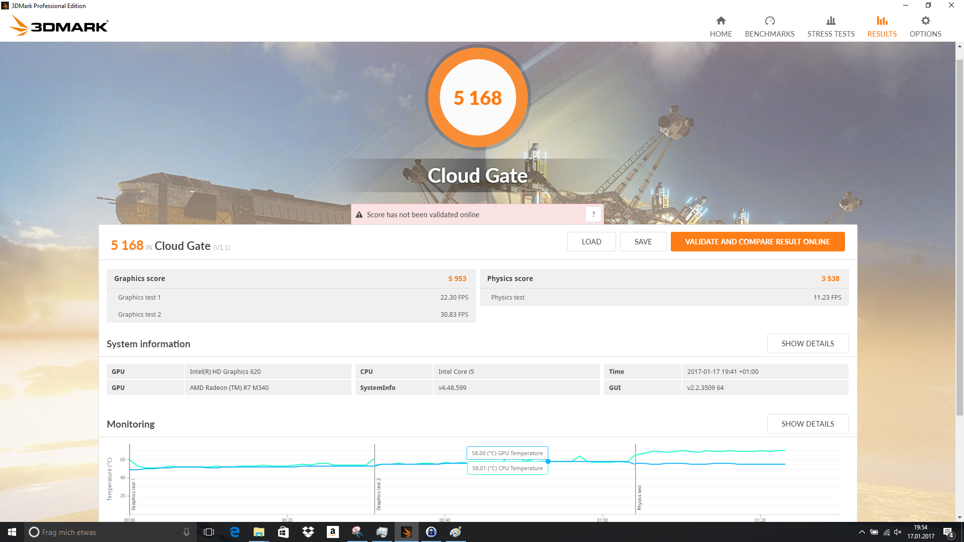 Im Anschluss an diese Dauerbelastung wurde der 3DMark 11 nochmals durchgeführt. Das HP Pavilion 17-x110ng erreichte 2.198 Punkte (etwa 200 Punkte weniger als zum Kaltstart).