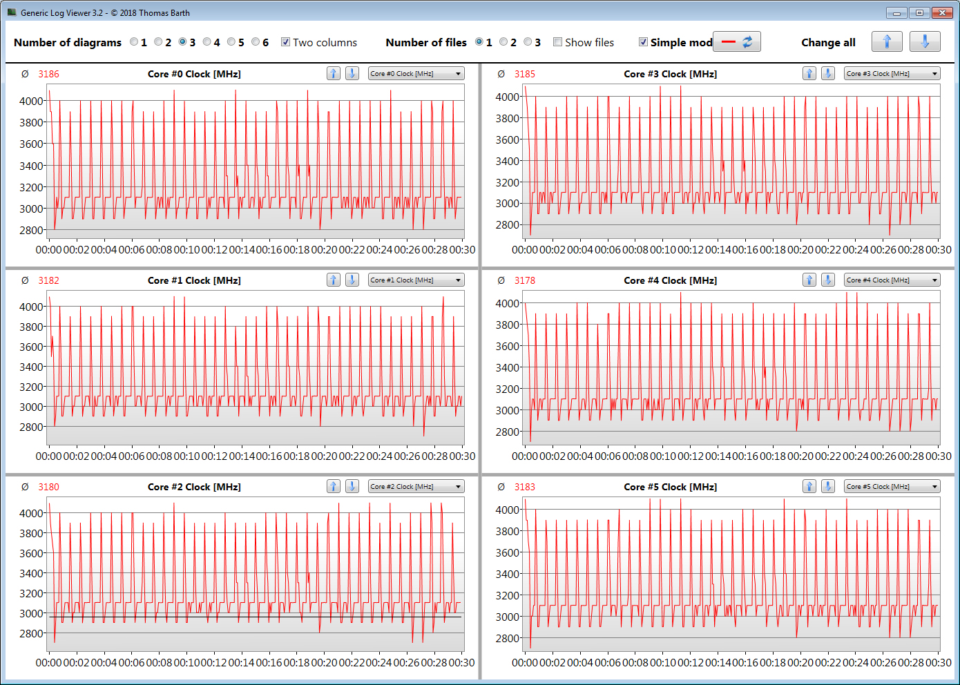 Die Multi-Thread-Tests der Cinebench-Benchmarks bearbeitet der Prozessor für wenige Sekunden mit 3,5 bis 4 GHz. Dann sinkt der Takt auf 2,8 bis 3,1 GHz. Die Single-Thread-Tests werden mit 3,9 bis 4,1 GHz durchlaufen. Soweit das Verhalten im Netzbetrieb. Im Akkubetrieb arbeitet der Prozessor mit 2,2 bis 2,7 GHz (Multi-Thread) bzw. 2,4 bis 4,1 GHz (Single-Thread).