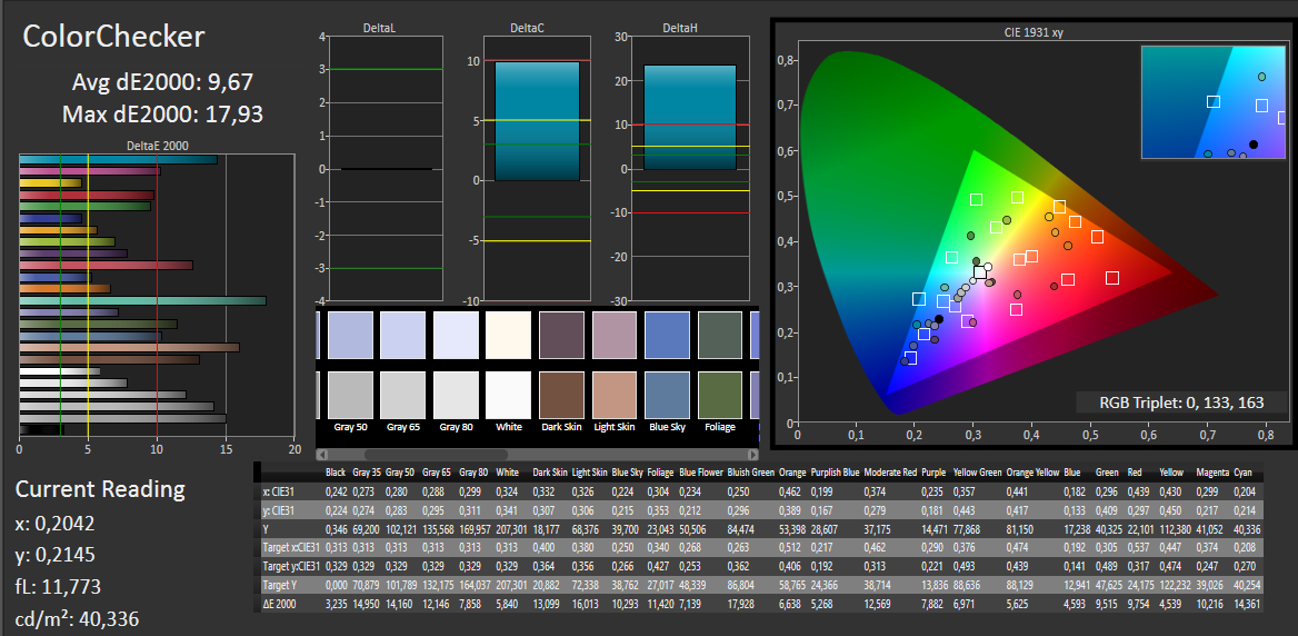 ΔE ColorChecker Calman: 9.67 | ∀{0.5-29.43 Ø4.79}
