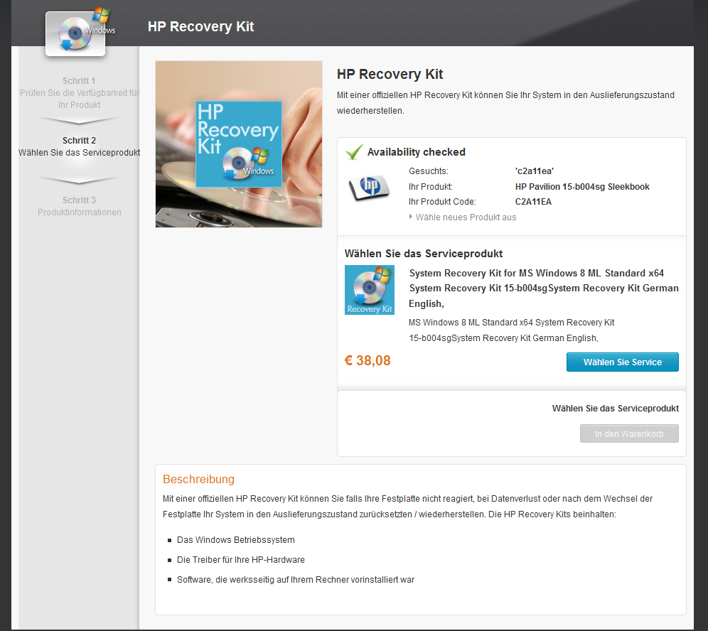 Das Sleekbook wird mit vorinstalliertem Windows 8 (64 Bit) ausgeliefert. Eine Windows DVD liegt nicht bei. Es empfiehlt sich Wiederherstellungsmedien mit Hilfe des vorinstallierten HP Recovery Manager anzulegen. Dabei kann es sich um DVDs (in diesem Fall wird ein externer Brenner benötigt) oder ein USB-Laufwerk handeln. So kann das System nach einem möglichen Festplattentausch - beispielsweise gegen eine Solid State Disk - wieder eingespielt werden. Alternativ besteht die Möglichkeit, einen Satz Recovery-DVDs direkt bei HP zu kaufen. Diese enthalten neben dem Betriebssystem auch alle Treiber und die vorinstallierte Software. Der Preis liegt aktuell bei knapp 38 Euro. Die Wiederherstellungs-DVDs können auf dieser Webseite bestellt werden. Dazu wird die Produktnummer des Notebooks (steht auf der Verpackung) benötigt.