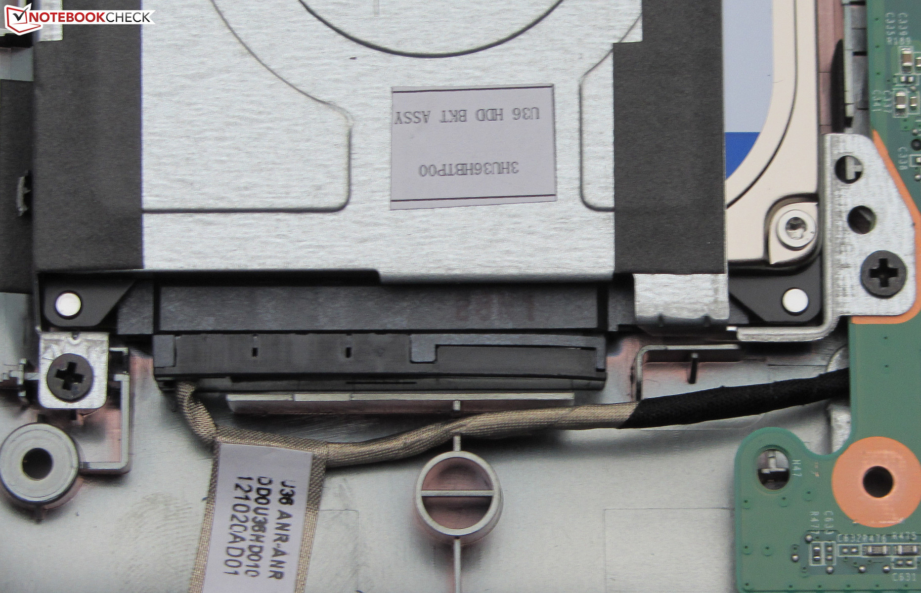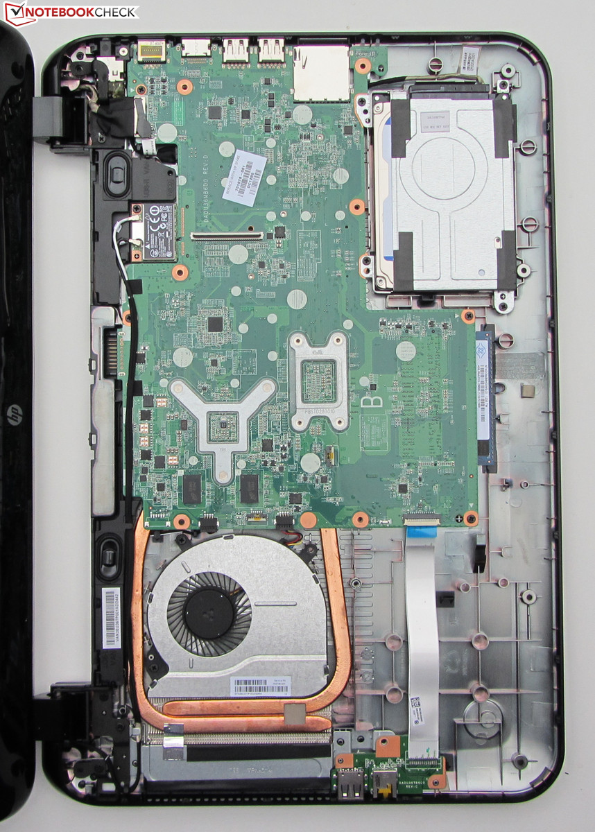 Jetzt ist der Blick auf die Hauptplatine frei. Allerdings betrachtet man die Rückseite der Hauptplatine. An dieser Stelle ist der Zugriff auf den Lüfter und die Festplatte gegeben. Letztere könnte nun problemlos gegen ein anderes Modell getauscht werden. Um an den SSD-Cache und den Arbeitsspeicher (zwei Speicherbänke, beide belegt, maximal 8 GB) zu gelangen, müsste die Hauptplatine ausgebaut werden. Wer sich genauer mit dem Auseinanderbauen des Sleekbooks beschäftigen möchte, kann sich das zugehörige Hardware-Handbuch von der HP-Webseite herunterladen.