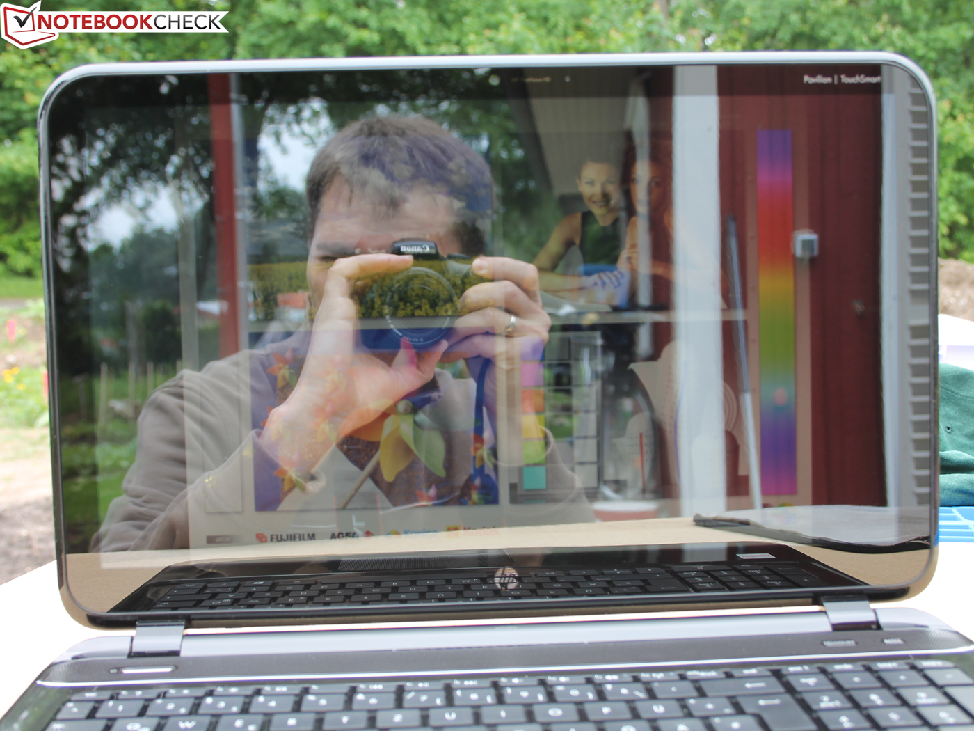 Schlechte Noten geben wir dem Glare-Panel im Außengebrauch. Die niedrige Helligkeit, zusammen mit den starken Reflexionen: Wir erkennen nichts mehr. Unsere Fotos entstanden bei Bewölkung, sie sprechen mehr als tausend Worte.