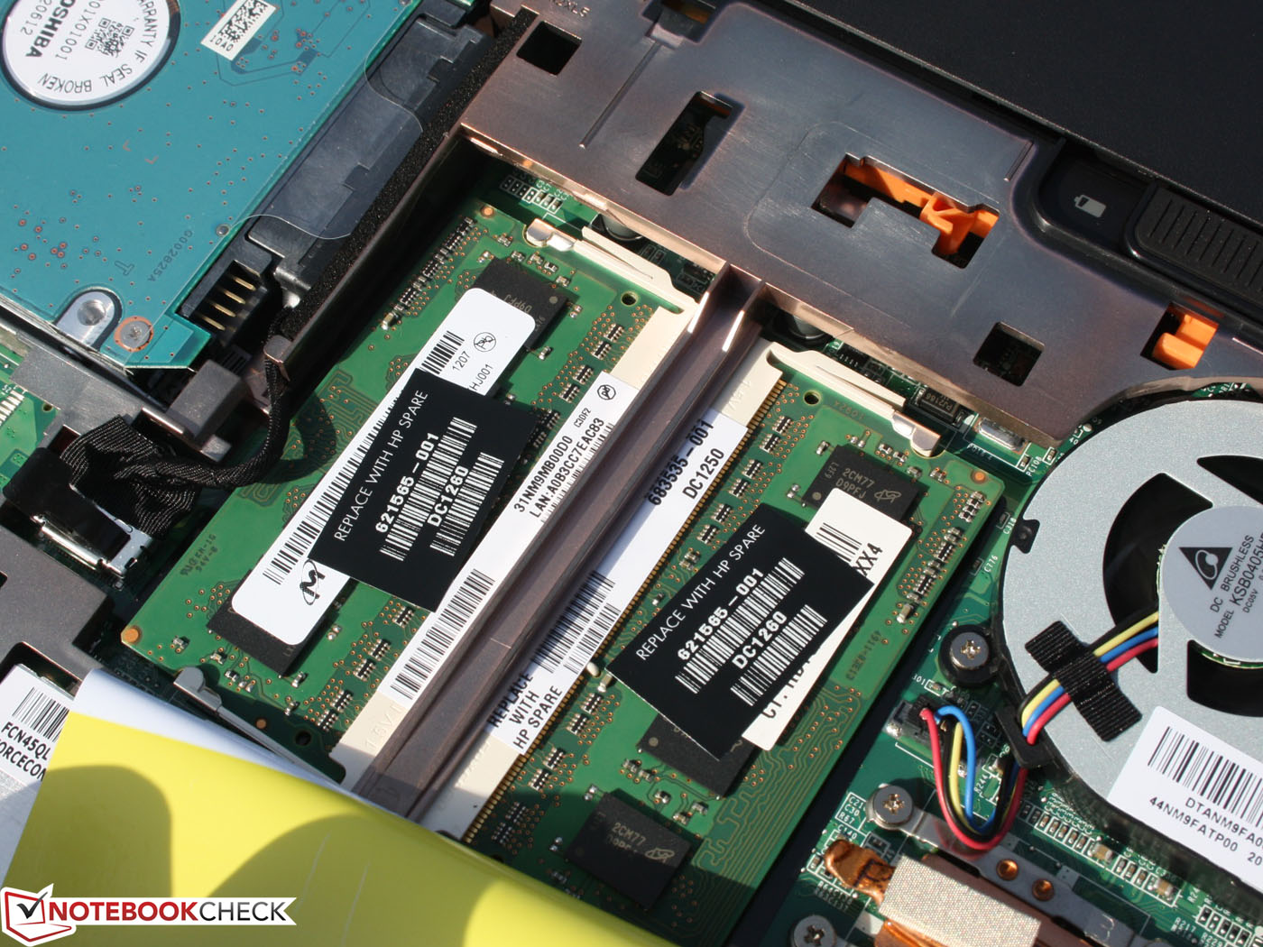 Die abnehmbare Bodenplatte bietet Aufrüst-Optionen. Unser Testgerät ist mit 2 x 2 GB Arbeitsspeicher bestückt. Das WLAN-Modul und die Festplatte sind eben so schnell zu ersetzen, wie die CMOS-Batterie. Der Lüfter kann mit Druckluft gereinigt werden.