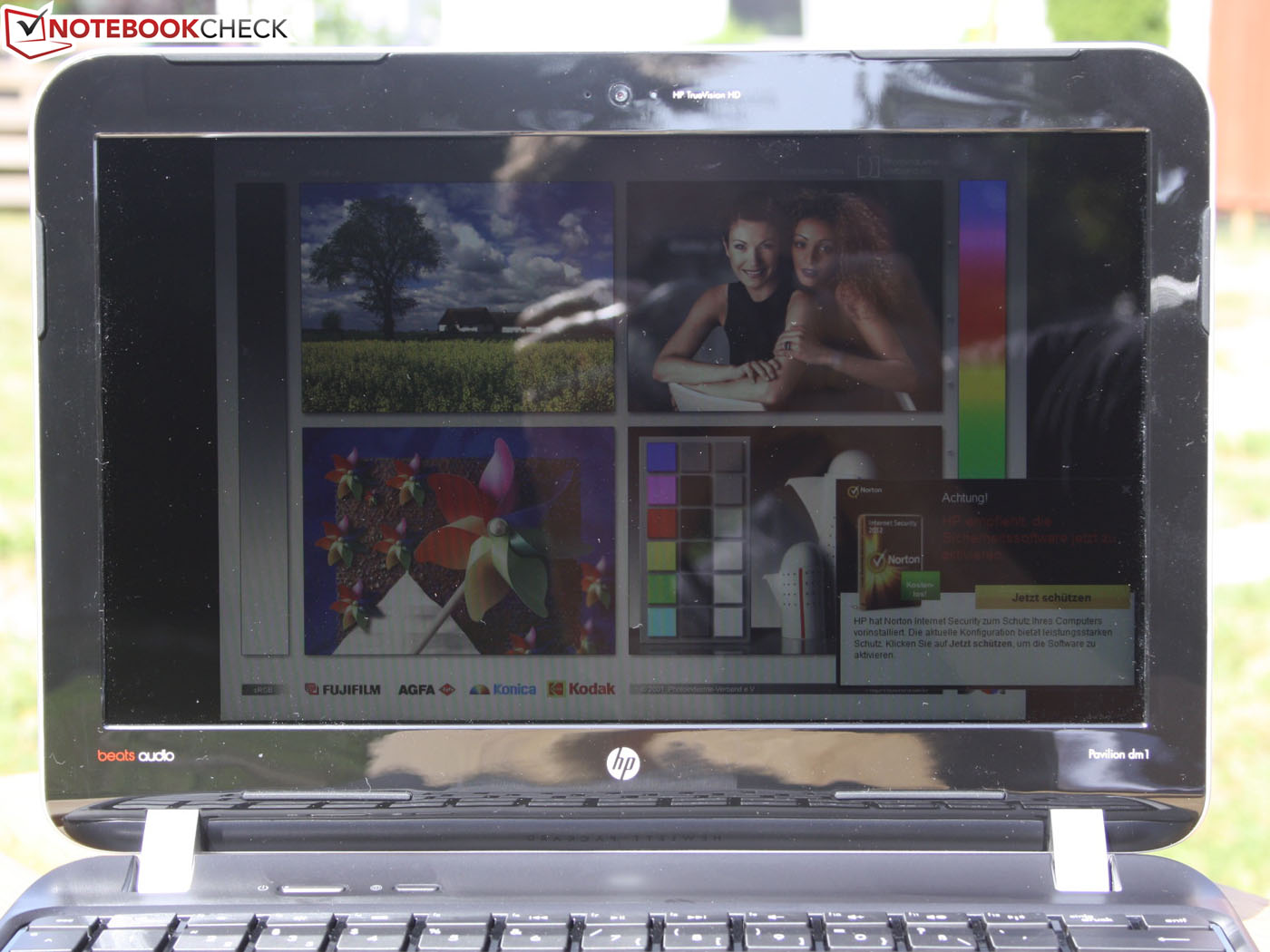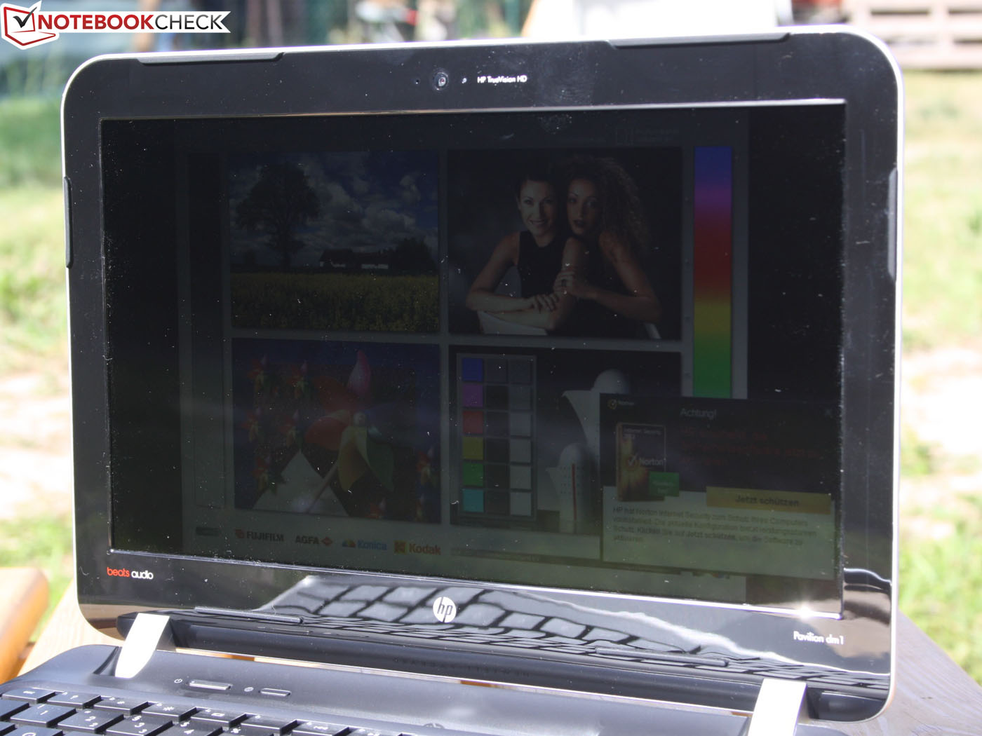 Die Helligkeit der Anzeige ist mit 198 cd/m² für Innenräume ausreichend, genügt aber nicht, um der Spiegelung im Tageslicht entgegen zu treten. Selbst bei einem matten Panel wären für den Sonnenplatz idealerweise 250 cd/m² nötig, um den Desktop augenfreundlich ablesen zu können. So aber werden wir beim gemütlichen E-Mail-Check bei Kaffee und Kuchen von Reflexionen gestört. Der Desktop hüllt sich unter hellem Tageslicht mehr oder weniger in Dunkelheit.