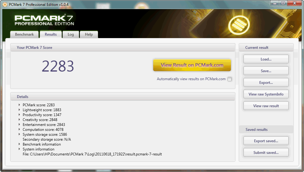 Wir haben weiterhin den PCMark 7 ausgeführt, welcher auf 2.283 Punkte endet. Aktuelle Core i7-Quad-Systeme mit ähnlicher Mittelklasse-GPU, wie das Lenovo IdeaPad Y560p (2630QM, HD 6570M) liegen gleichauf (2.137). Sofern eine SSD ins Spiel kommt, wie beim Acer Aspire Ethos 8951G (GT 555M), steigt die Gesamt-Leistung aber deutlich: 3.430 beim Ethos 8951G.