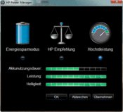 Unter Belastung des Prozessors kann das Gesamt-System bis zu 80 Watt benötigen (z. B. Prime95). Der Last-Test BatteryEater-Classic endet daher schon nach einer guten Stunde. Das wuchtige 120 Watt Netzteil benötigt zum vollständigen Laden zwei Stunden. Im HP Power Manager können Energie-Voreinstellungen gewählt werden. Hier werden im Wesentlichen die Windows-Energiemodi repliziert.