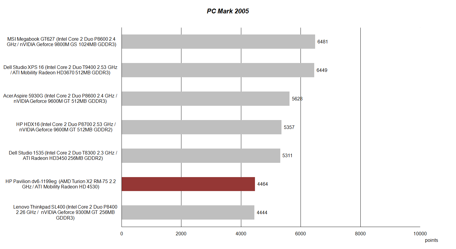 HP schmückt sich bei der Ausstattung der dv6-Geräte mit stolzen 4 Gigabyte Arbeitsspeicher in allen Konfigurationen (DDR2). Allerdings hat dies einen Haken: Da nur eine 32-bit Version von Windows Vista Home Premium zur Anwendung kommt, können diese nicht zur Gänze unter Windows genutzt werden. Dies spiegelt zum Teil auch das nur mäßige Ergebnis im PCMark 2005 Benchmarktest wieder.