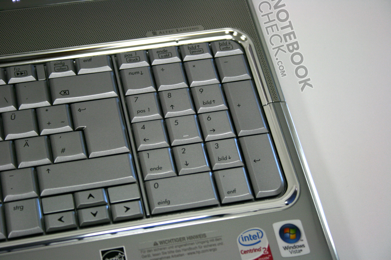 HP nutzt im dv7-1050eg Notebook die volle Gehäusebreite aus und verbaut eine große Tastatur inklusive Ziffernblock. Im Vergleich zum Keyboard der dv5-1000 Serie, sind die Pfeiltasten und die Positionierungstasten (Pos1, Ende, Page Up, Page Down) geschrumpft um dem Ziffernblock genügend Platz einzuräumen. Das Layout ist jedoch immer noch sehr gelungen und ermöglicht die sofortige blinde 10-Finger Bedienung. Auch die Benutzung der einzelnen Tasten gefiel uns im Test dank ausreichend Hubweg und gut fühlbaren Druckpunkt sehr gut. Die Stabilität der gesamten Tastatureinheit war jedoch nicht ganz so gut wie beim dv5 und daher bog sich das Keyboard bei Benutzung in der Mitte leicht durch.