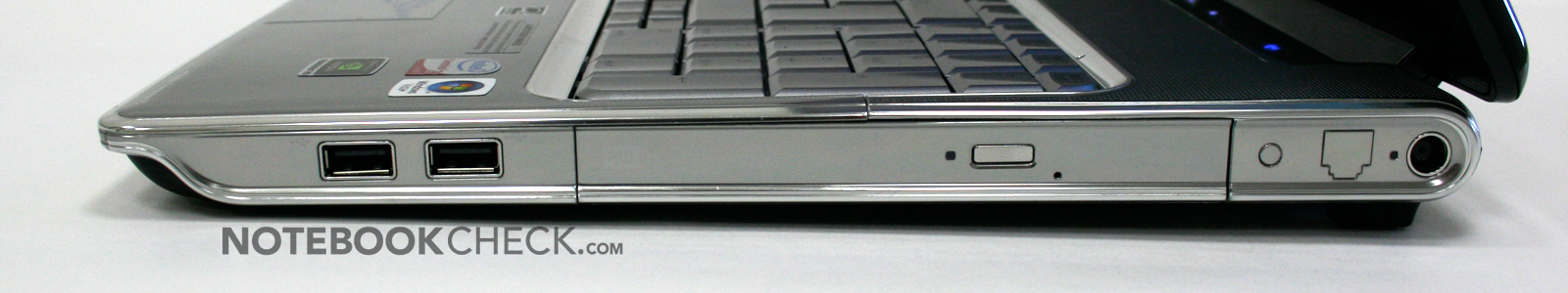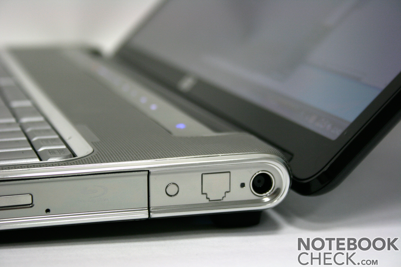 Die Anschlussoptionen sind wie bei der kleineren dv5-1000 Serie sehr vollständig (ident zu unserem dv5-1032eg Testgerät). Als Highlights kann man den HDMI Anschluss, den eSATA Port (mit integrierter USB Buchse), den proprietären Dockingstation-Anschluss und die zwei Kopfhöreranschlüsse nennen. Im 1050eg Modell der dv7 Serie ist (wie beim dv5-1032eg) weder ein Modem Anschluss noch eine TV-Karte verbaut (bei manchen dv7 Modellen integriert).