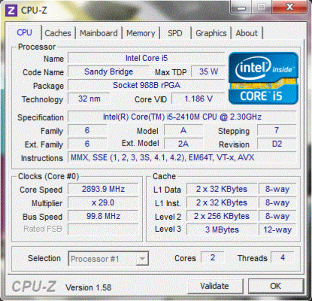Für Gamer steht hingegen der Turbo-Modus im Vordergrund. Je nach Temperatur und Auslastung wird der Takt einzelner Kerne dynamisch von standardmäßig 2.30 auf maximal 2.90 GHz hochgejagt. Wir haben den Turbo-Modus kurz mit dem Cinebench R10 getestet. Während der Takt im Single-Core-Rendering zwischen 2.80 und 2.90 GHz schwankte, siedelte sich der Prozessor im Multi-Core-Rendering bei 2.7 GHz an. Die Thermal Design Power ist mit 35 Watt nicht gerade niedrig, dafür enthält der Core i5-2410M jedoch auch einen Grafikchip namens HD Graphics 3000.