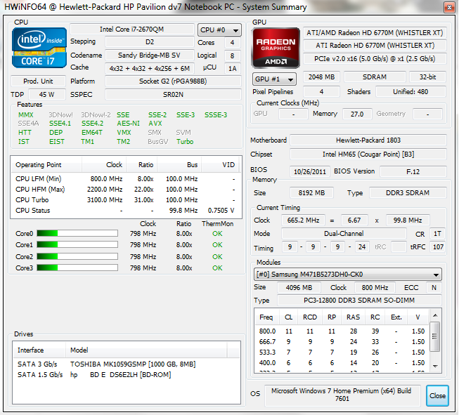 Obwohl der Speichercontroller des Prozessors maximal DDR3-1333 unterstützt, hat HP das Pavilion dv7 mit zwei schnellen 4-GByte-Modulen DDR3-1600 von Samsung ausgestattet. Ebenso großzügig ist die 1000 GByte große Festplatte. Auf Details zu einer möglichen Aufrüstung sind wir im Abschnitt Wartung näher eingegangen.