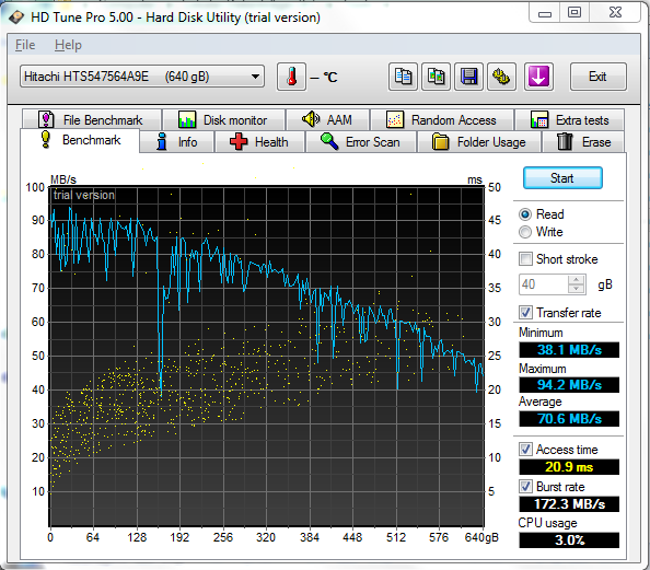 Bei der im Pavilion dv7 genutzten Festplatte, handelt es sich um ein 2.5 Zoll Modell mit einer (Brutto-) Kapazität von 650 GB. Für ein Multimedia-Notebook ist das nicht übermäßig viel, für die meisten Benutzer sollte der Festplattenspeicher aber durchaus genügen. Die Festplatte treibt die Magnetscheiben mit 5.600 U/min an. An den Daten erkennt man schnell, dass die verwendete Hitachi Festplatte nicht zu den schnellsten gehört. Eine durchschnittliche Transferrate von 70.6 MB/s ist nicht besonders hoch, und auch die Zugriffszeit gehört mit 20.9 Millisekunden eher zu den langsameren, selbst für eine Festplatte mit 5.400 U/min.