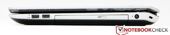 Die Positionierung der Anschlüsse ähnelt der Positionierung in den dv7-6xxx Notebooks sehr. Die Anschlüsse verteilen sich auf die beiden Seiten, wobei der Großteil der Schnittstellen auf die linke Seite gewandert ist. Rechts befindet sich neben zwei USB-Anschlüssen nur das optische Laufwerk und der Netzanschluss. Die Anordnung der Schnittstellen scheint nicht darauf ausgelegt worden zu sein, ein mögliches Kabelwirrwarr zu minimieren. Im Grunde lässt sich die Platzierung aber so beschreiben, dass die Anschlüsse für den stationären Betrieb ( Netzanschluss, VGA, HDMI) eher nach hinten verlagert wurden, während die USB-Anschlüsse sich im vorderen Bereich befinden.